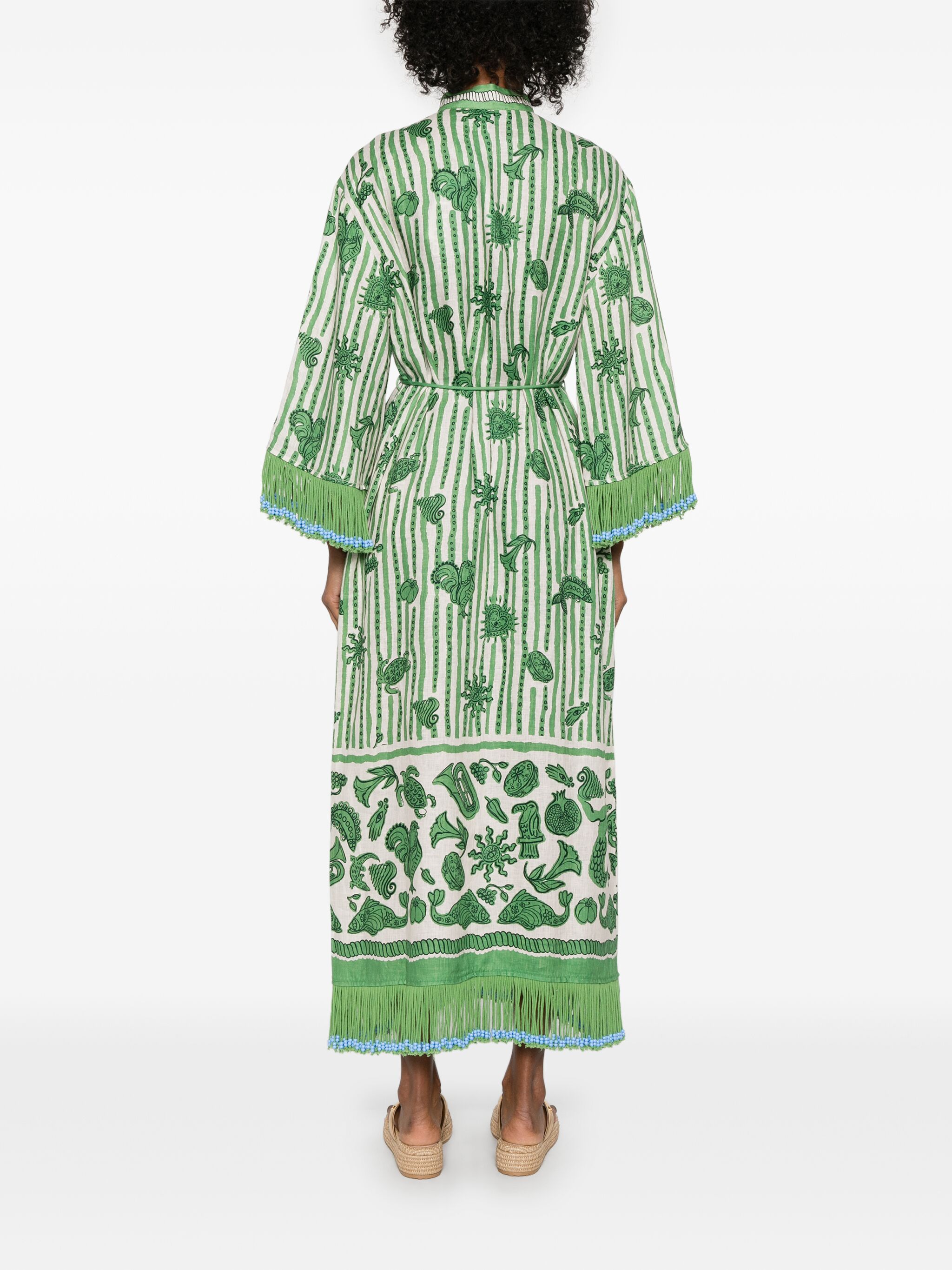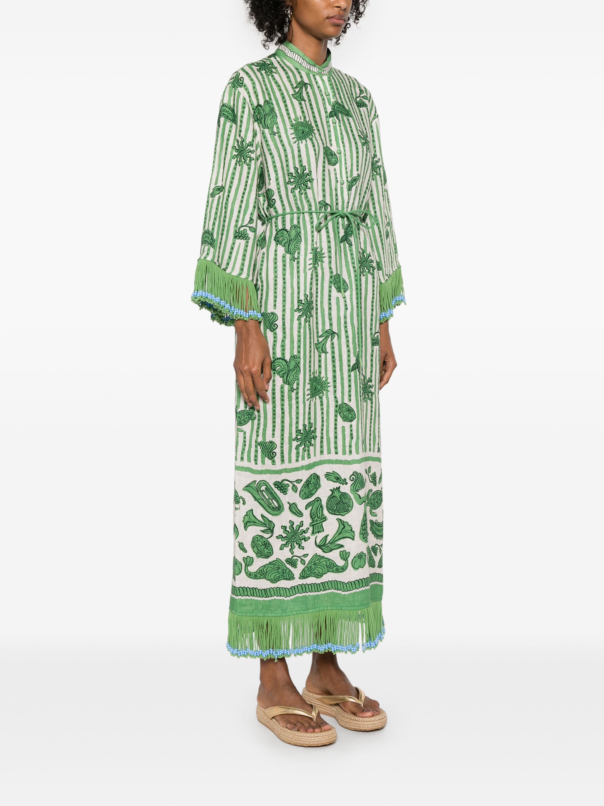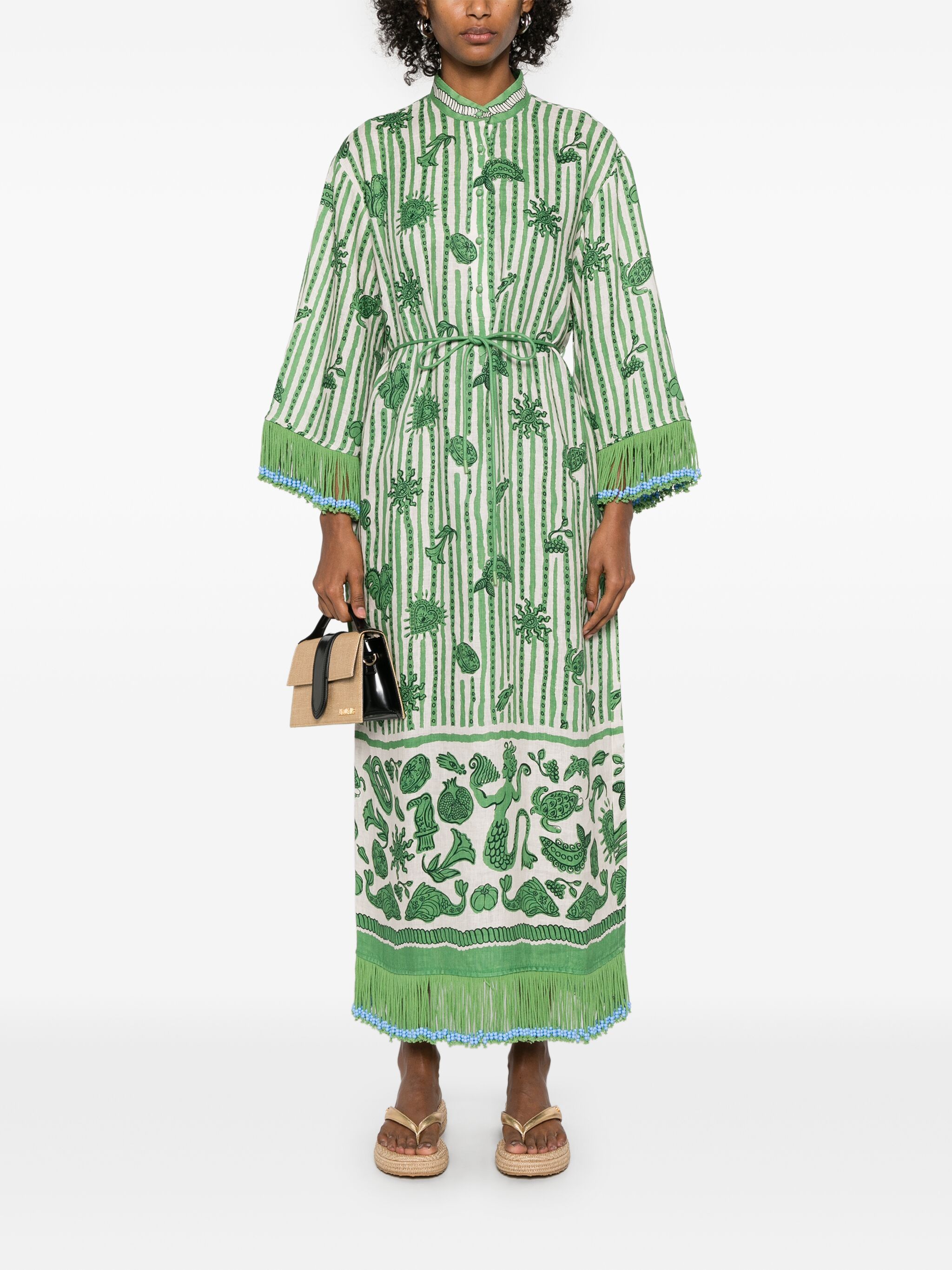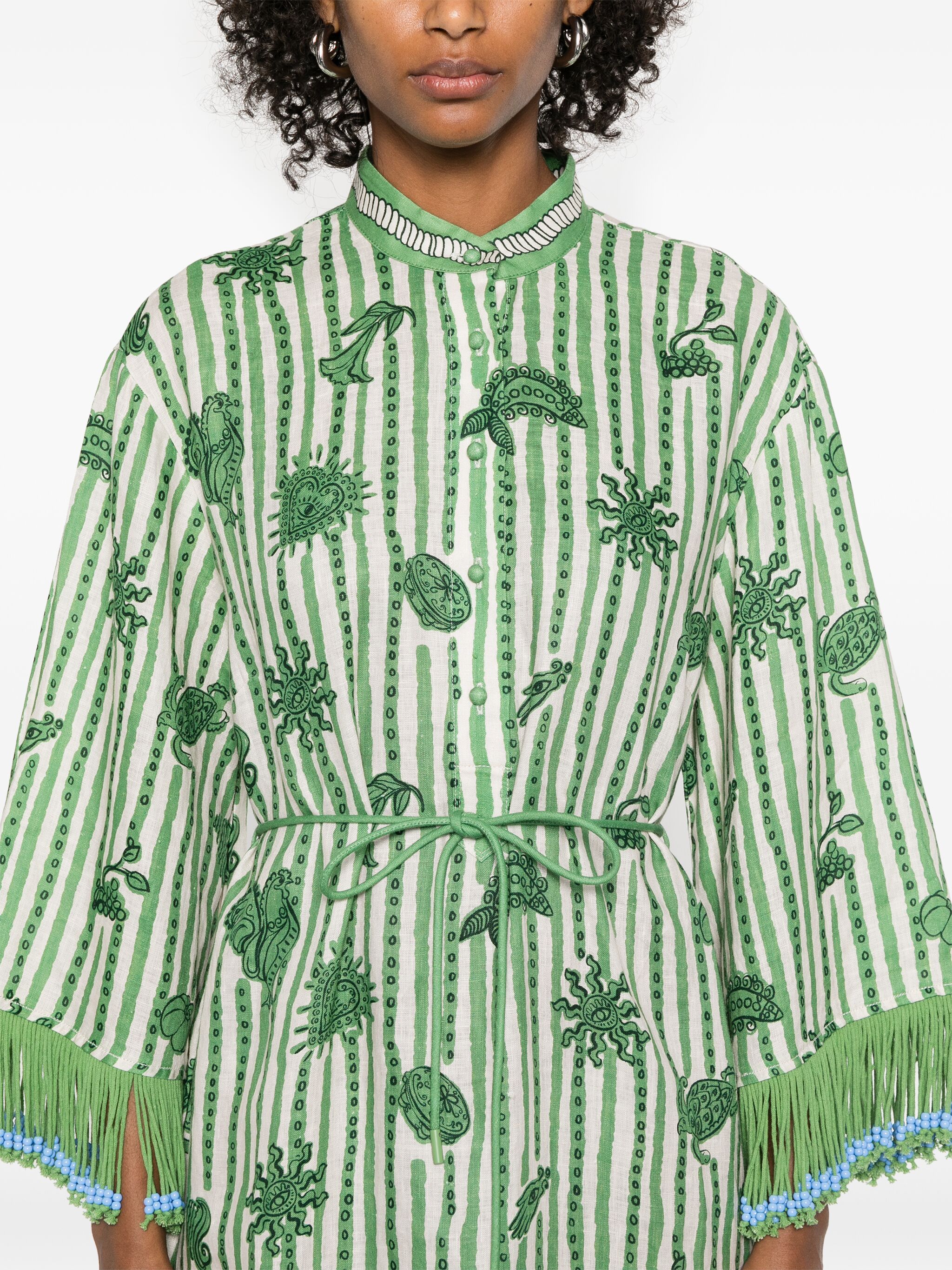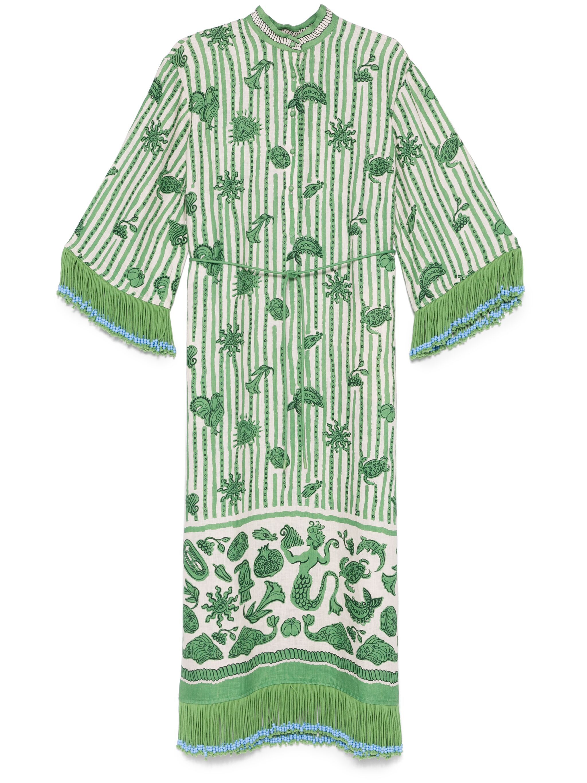 Lula Midi-Kleid von Alemais mit folgenden Eigenschaften: lockere Midikleider-Silhouette, Stehkragen, Knopfleiste mit verdeckten Knöpfen, entspannte Ärmel, Perlenfransen am Saum und am Ärmelsaum, Eingrifftaschen, Selbstrouleau-Gürtel mit Knebelverschlüssen.
