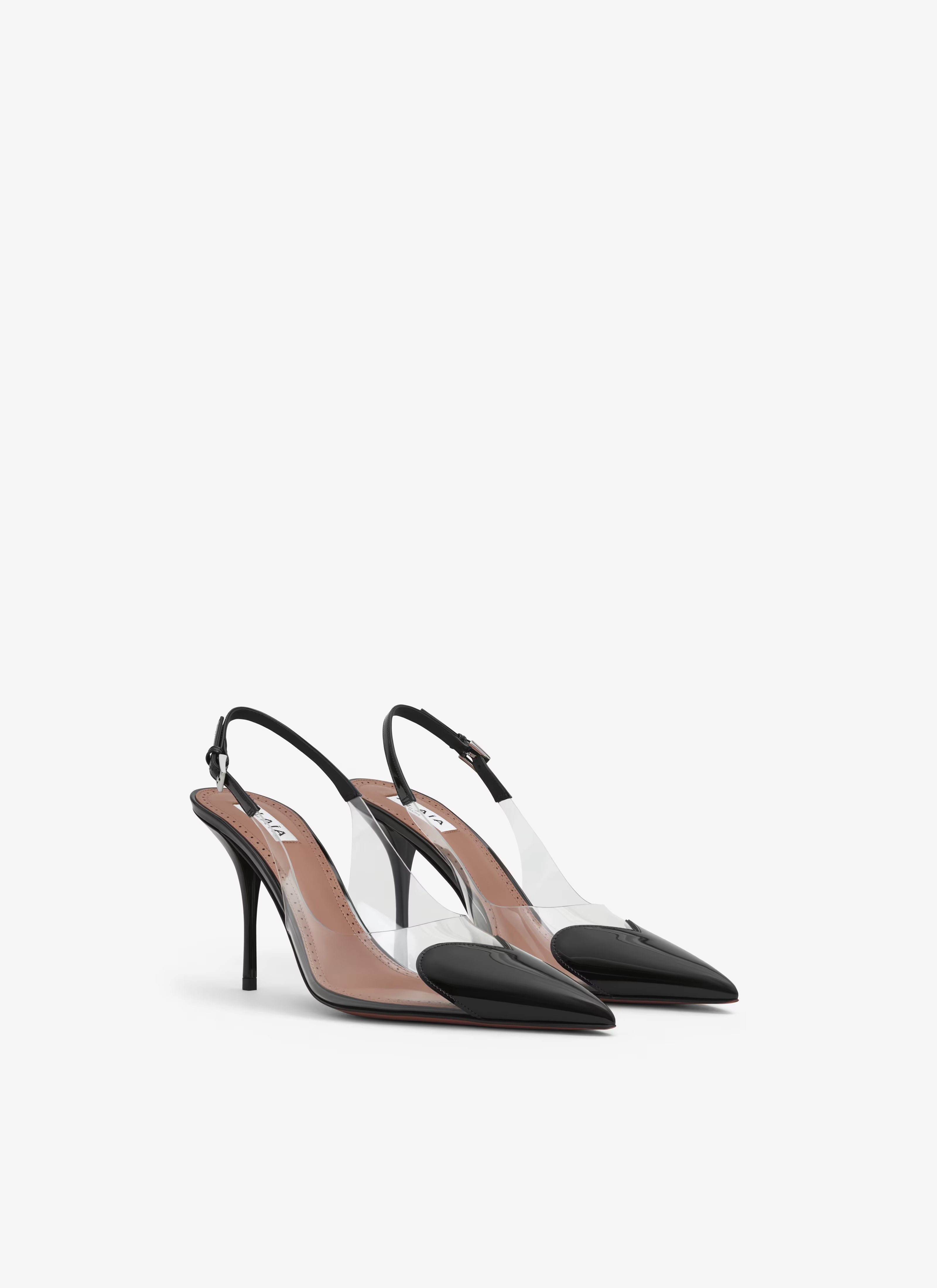 Highheels von Alaia mit folgenden Eigenschaften: Signatur-Herzausschnitt auf der Vorderseite des Schuhs, spitze Zehen, Schnallenriemen auf der Rückseite, Lackleder mit transparentem Polyuretan.