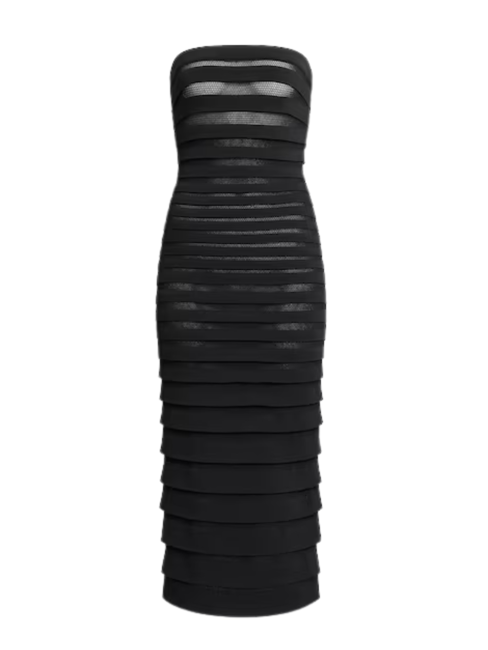 Kleid von Alaia mit folgenden Eigenschaften: Trägerloses Kleid aus strukturiertem Strick, taillierter Schnitt, transparenter Effekt mit blickdichten und perforierten Strickstreifen, Midi-Länge.