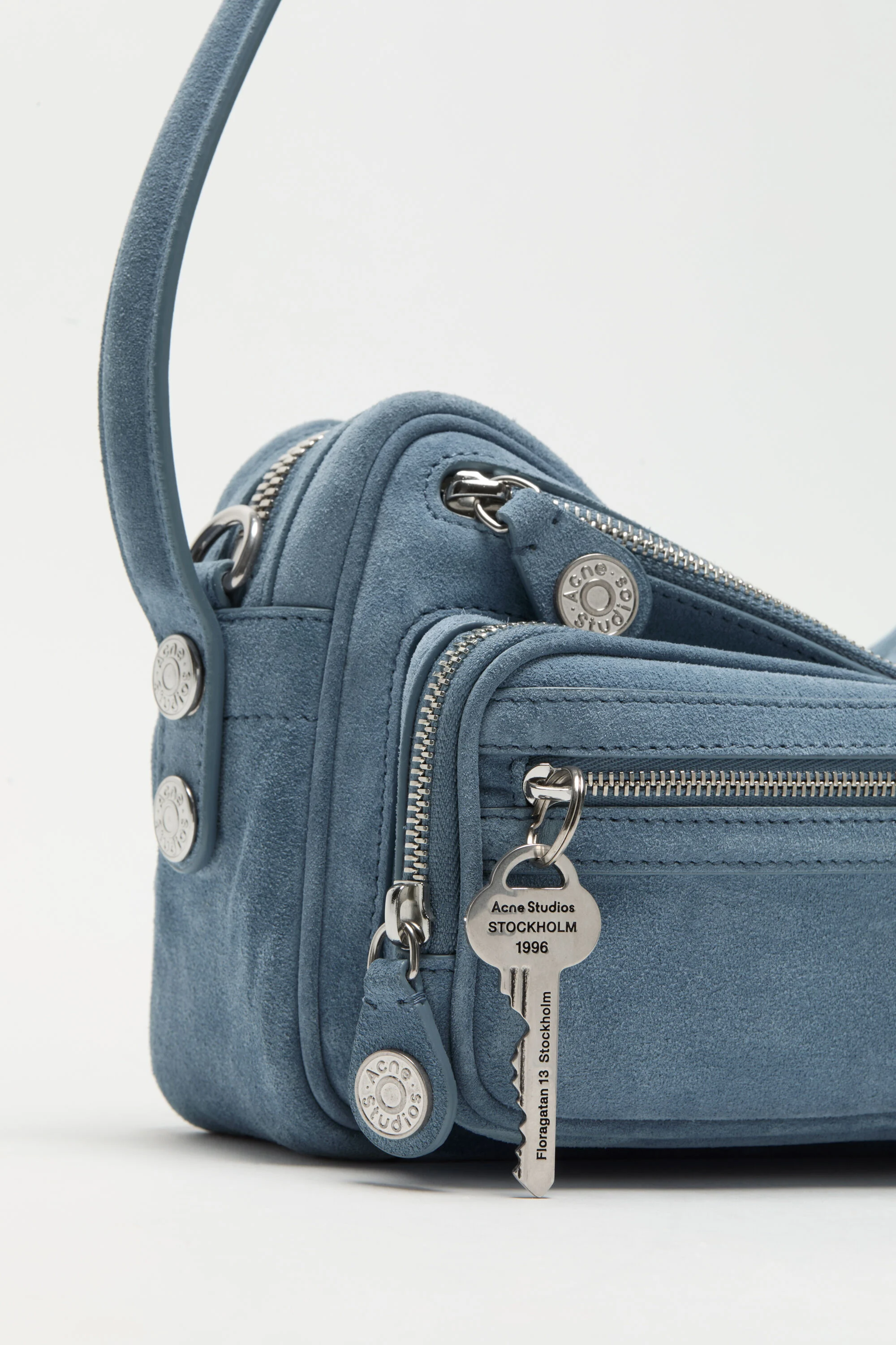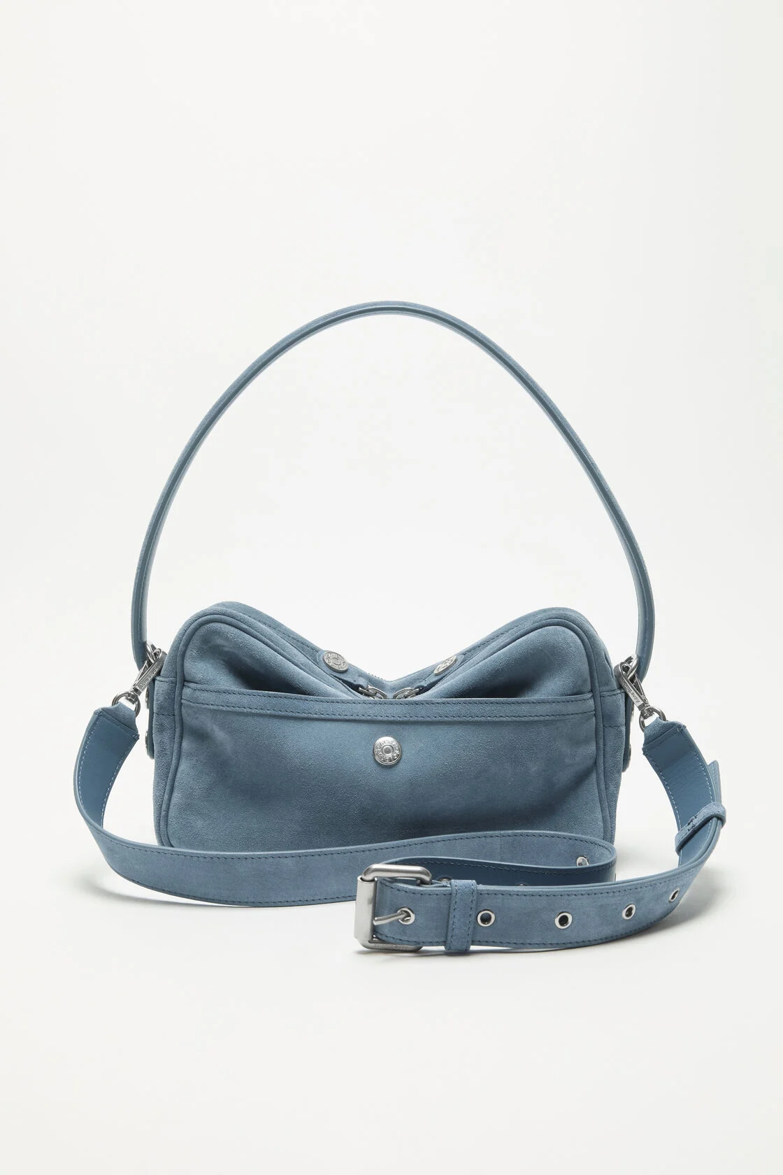 Die Camero Party Suede Schultertasche in Denimblau von Acne Studios mit folgenden Merkmalen: