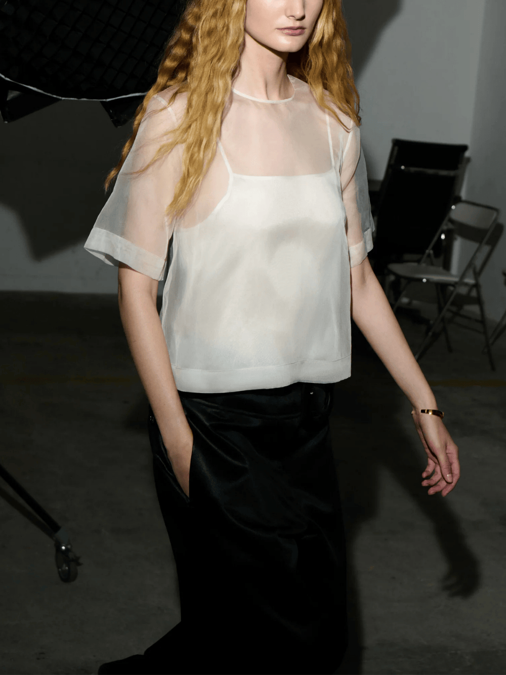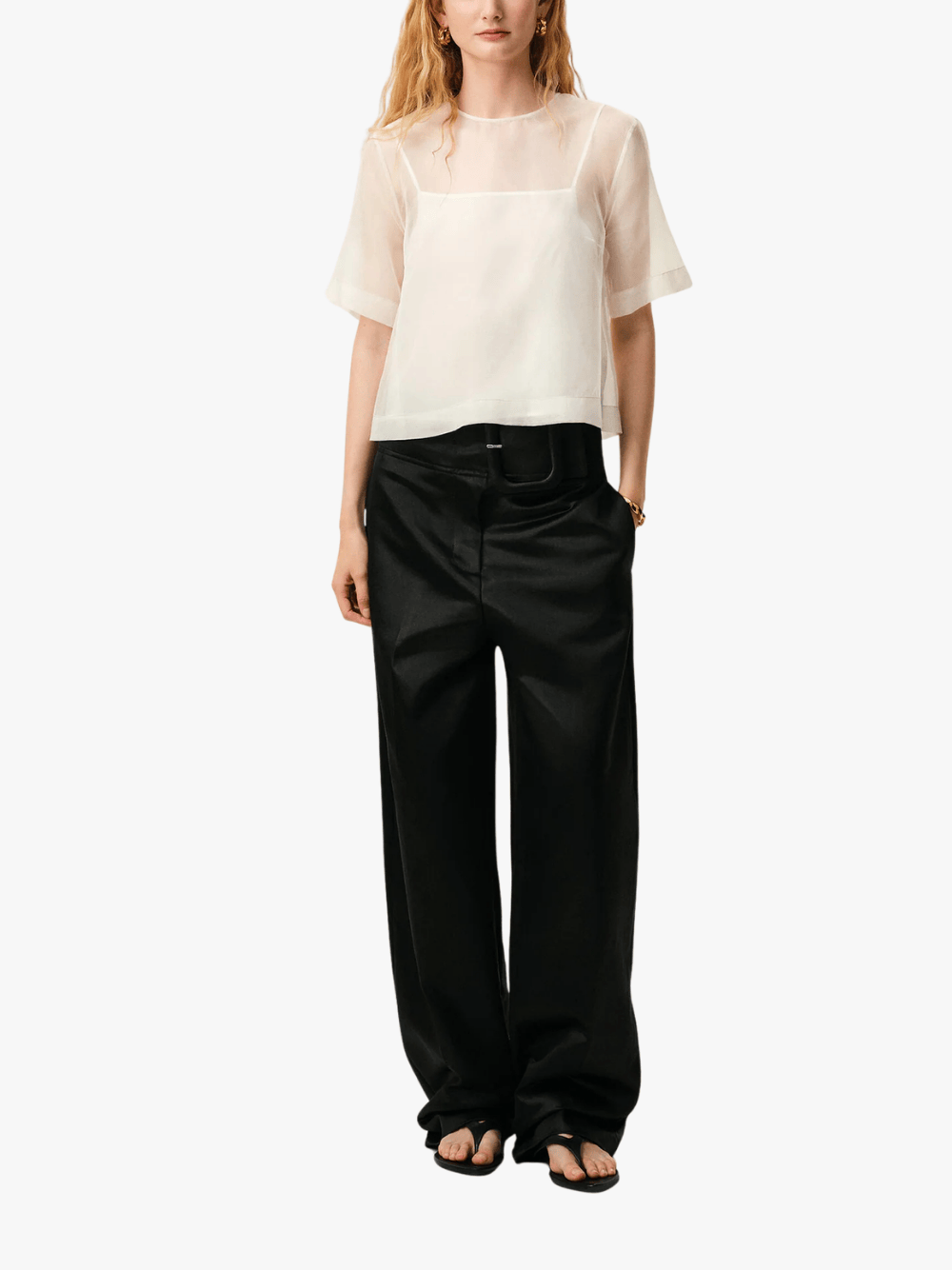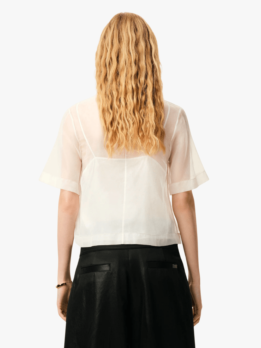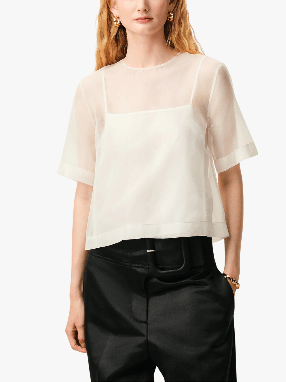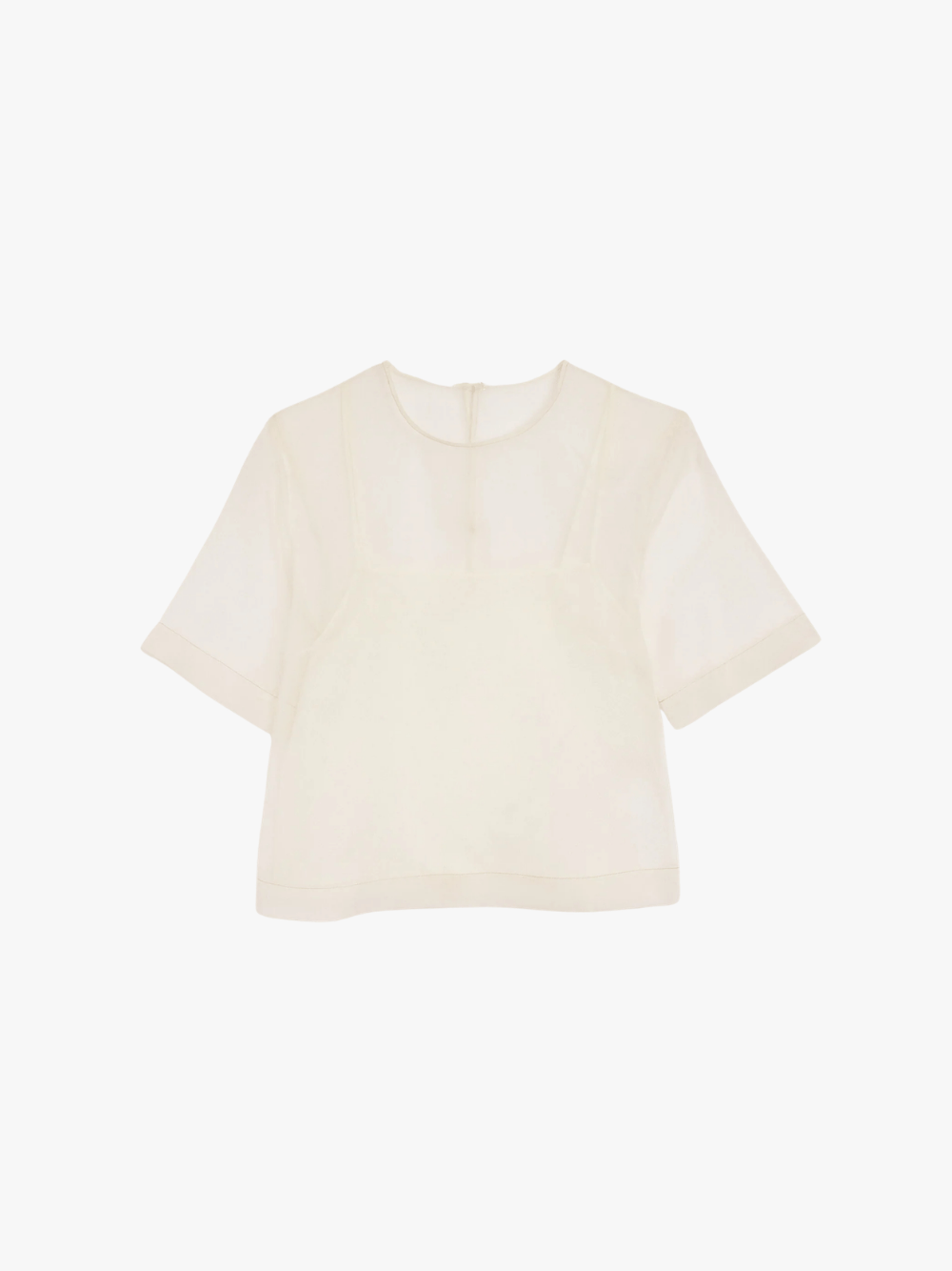• Elegantes Top aus feinem Seiden‑Organza mit semi‑transparenter Optik und kurzem Ärmel – leichte, fließende Struktur mit einem soften Fall.