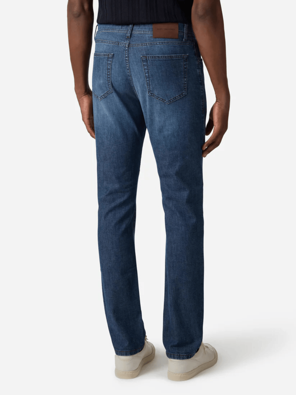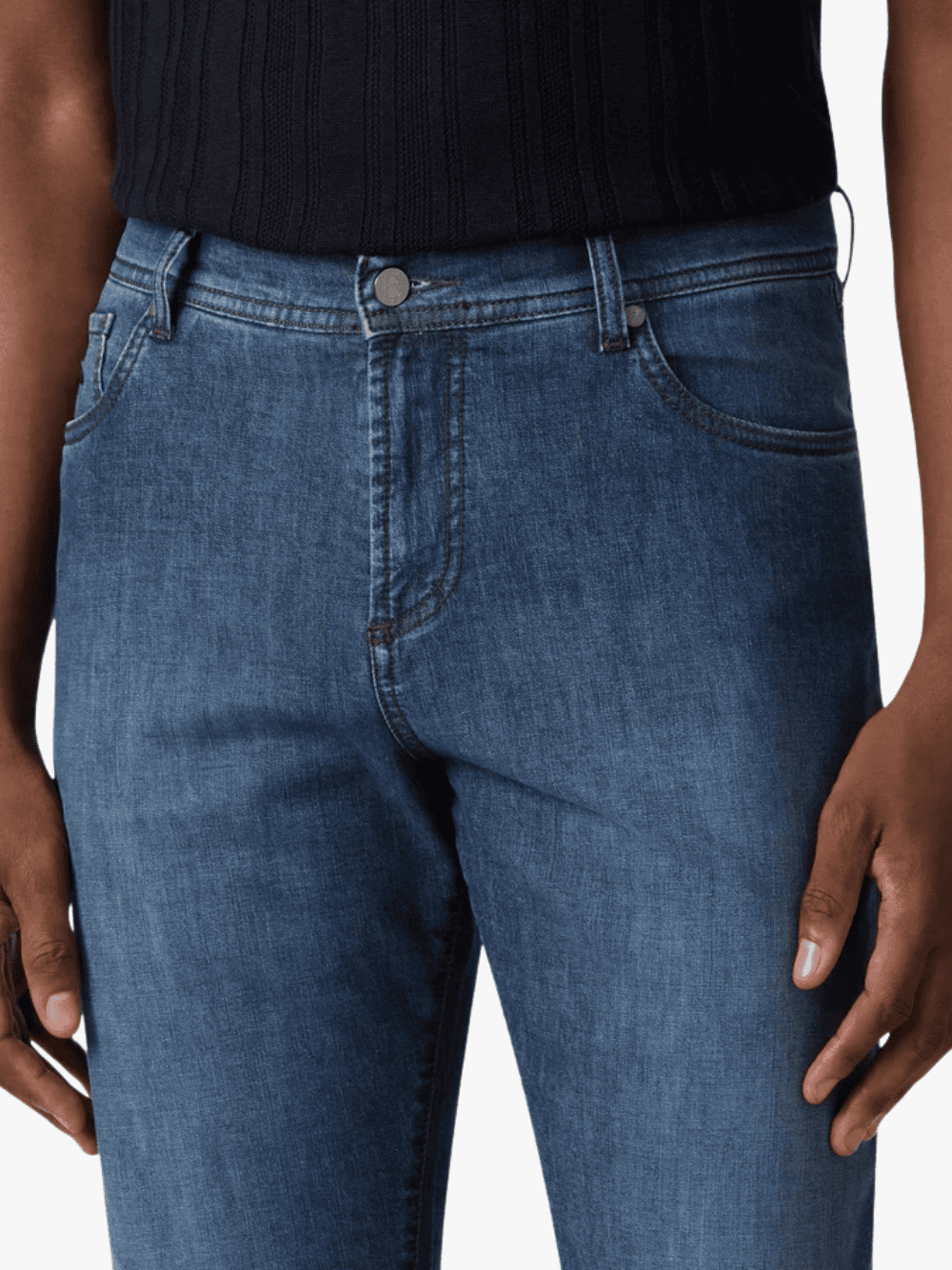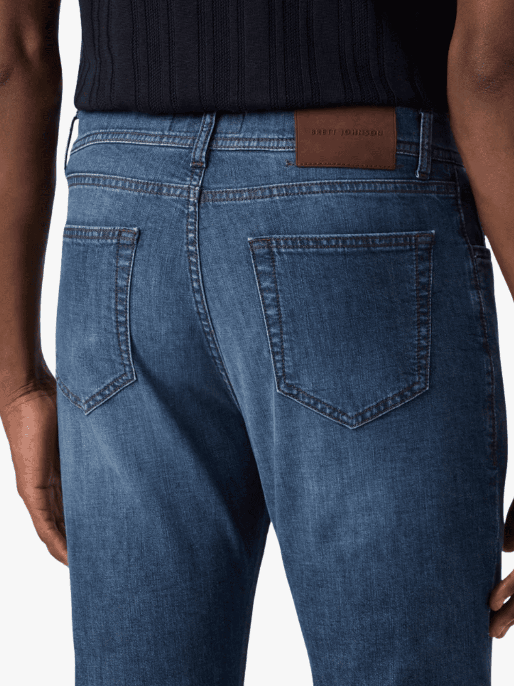 Die Cotton‑Modal‑Seide 5‑Pocket Denim in Mittelblau von Brett Johnson mit folgenden Merkmalen: