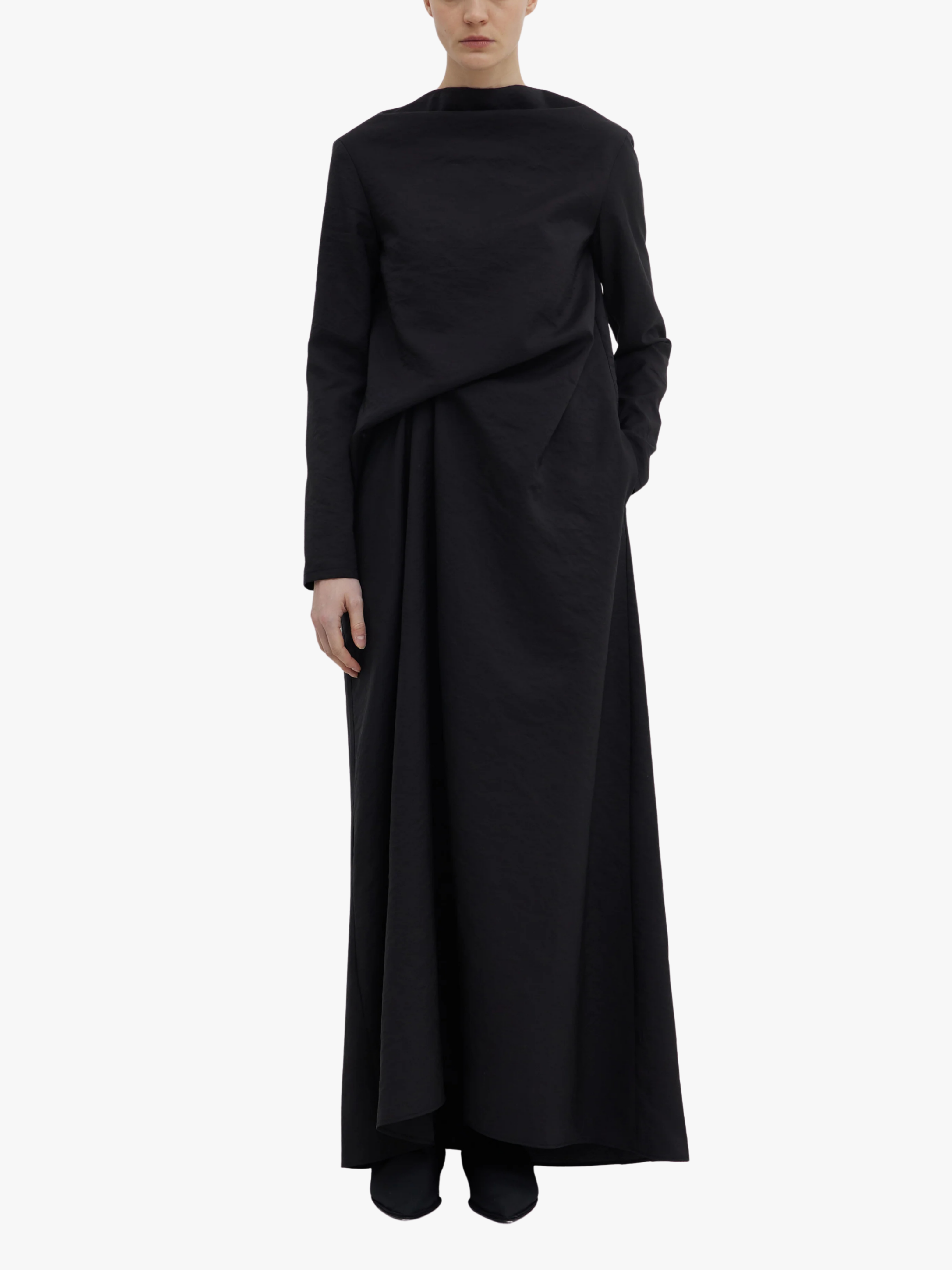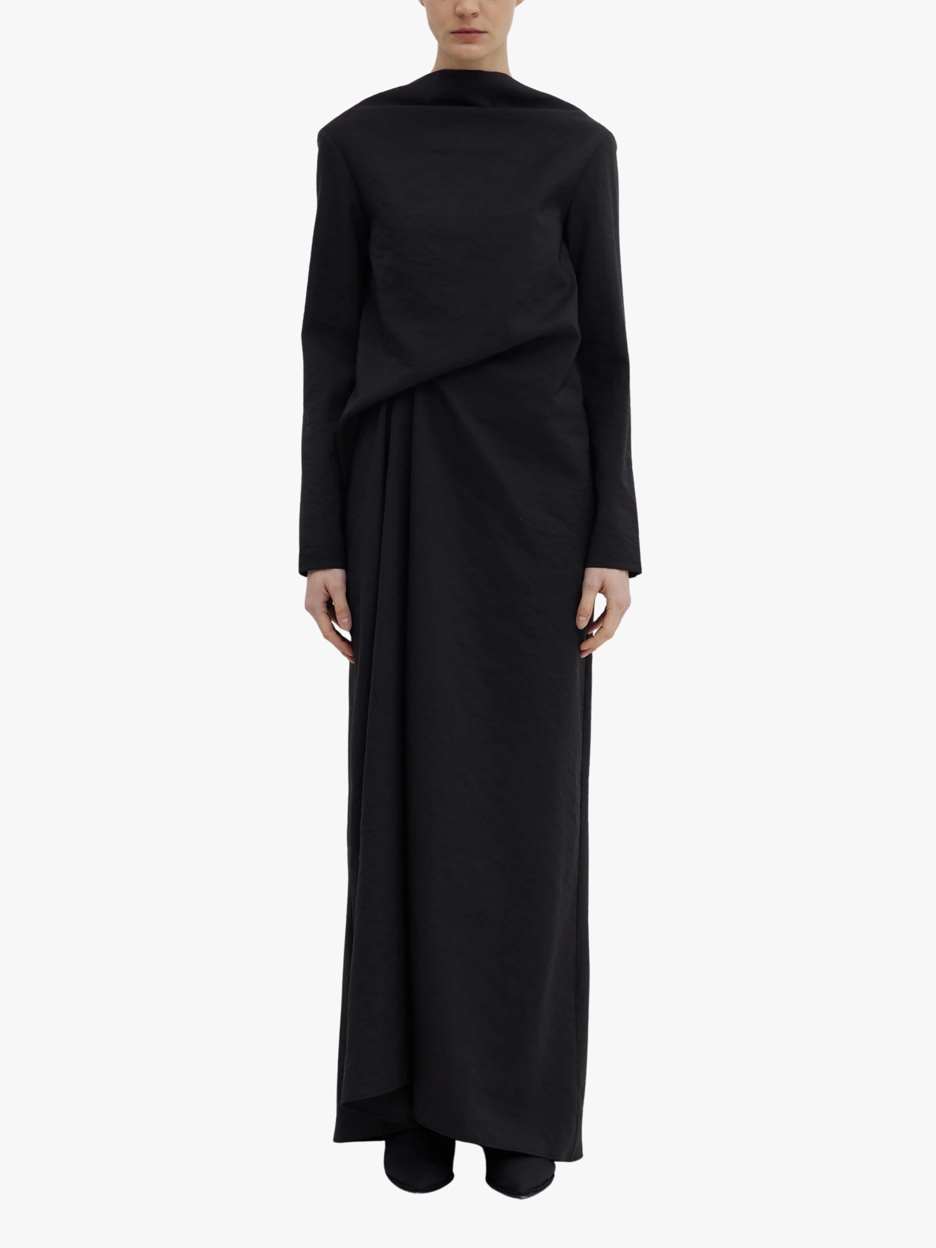 • Hoher Halsausschnitt und subtile Asymmetrie im Oberteil – verleiht dem Kleid eine moderne, architektonische Silhouette