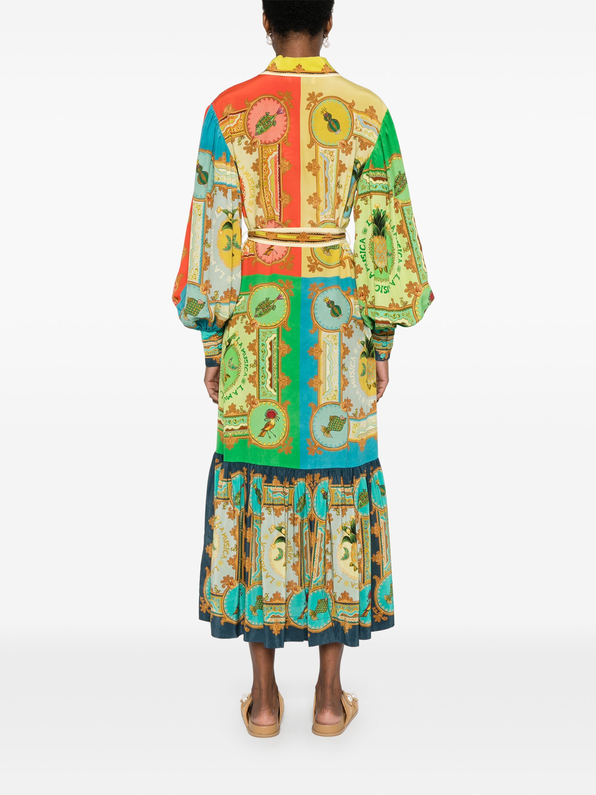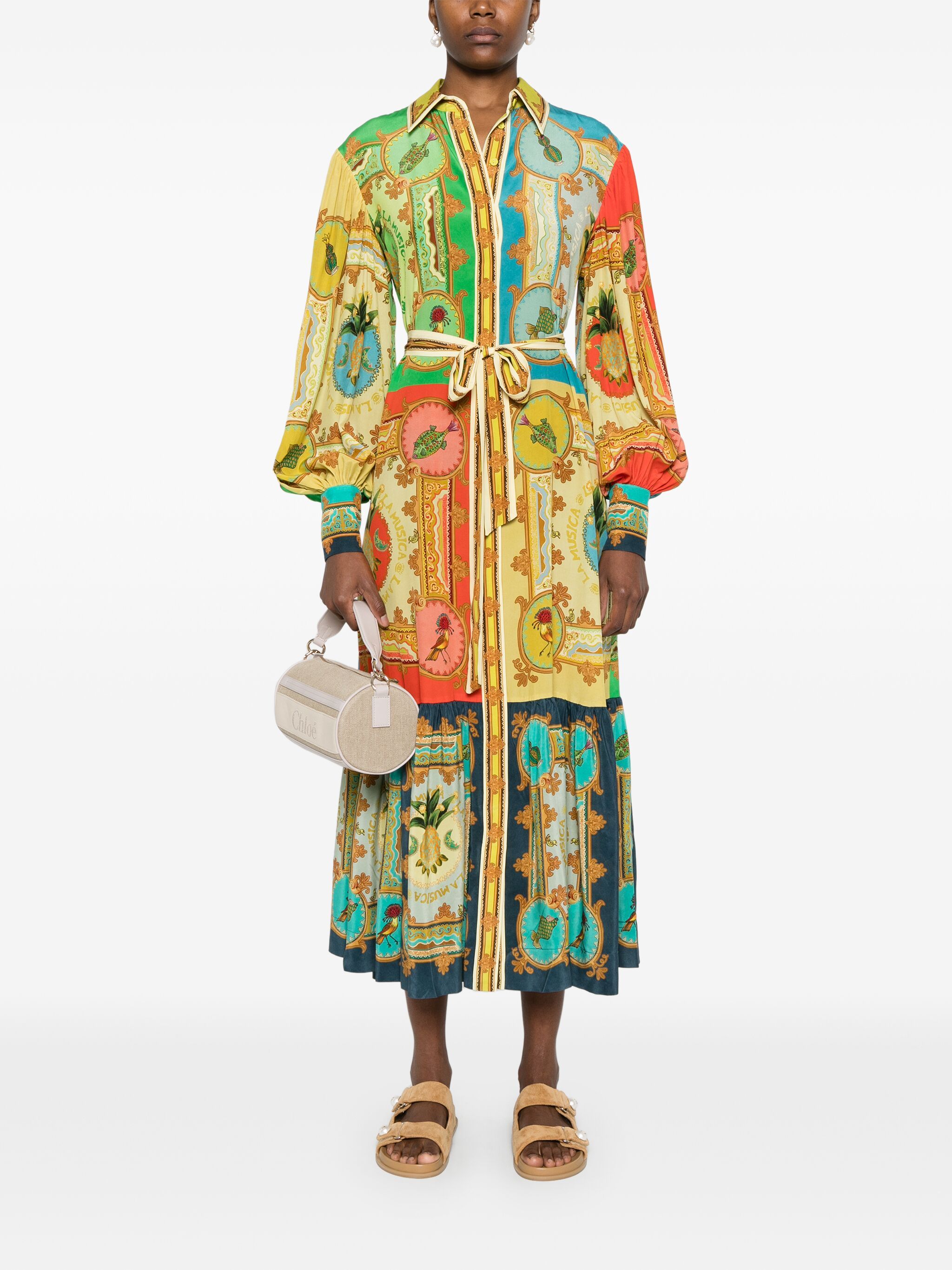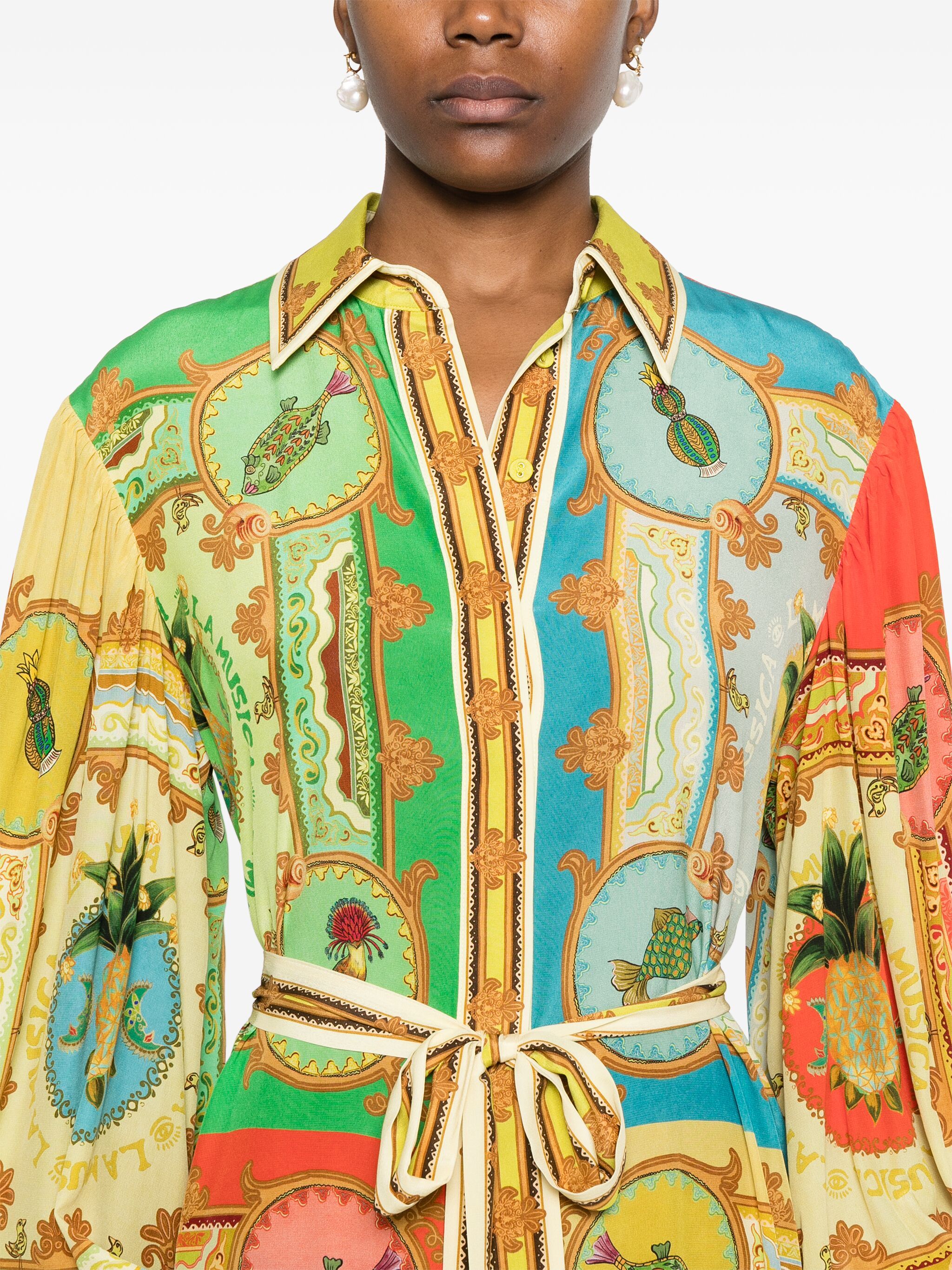 Dress from Alemais featuring graphic all-over print, loose shirtdress silhouette, pointed collar and stand-up collar, concealed button placket with self-adhesive buttons, balloon sleeves with attached cuff and buttons, slit pockets, self-tie belt, ruffled hem, mid-calf length.