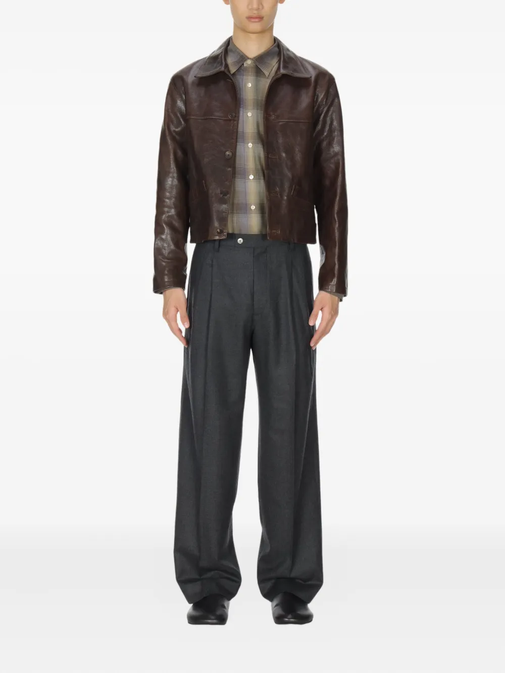 Lightweight pants with two pleats by Auralee in dark gray with the following features:
