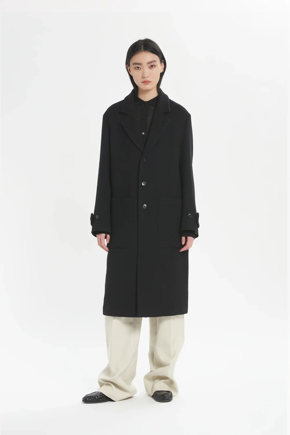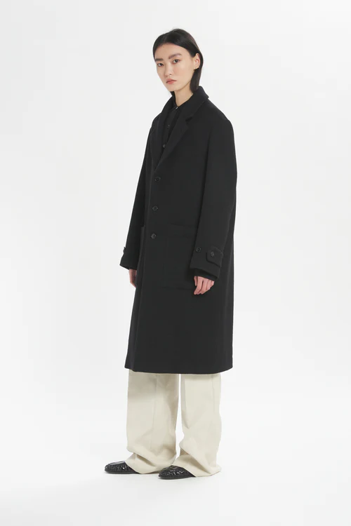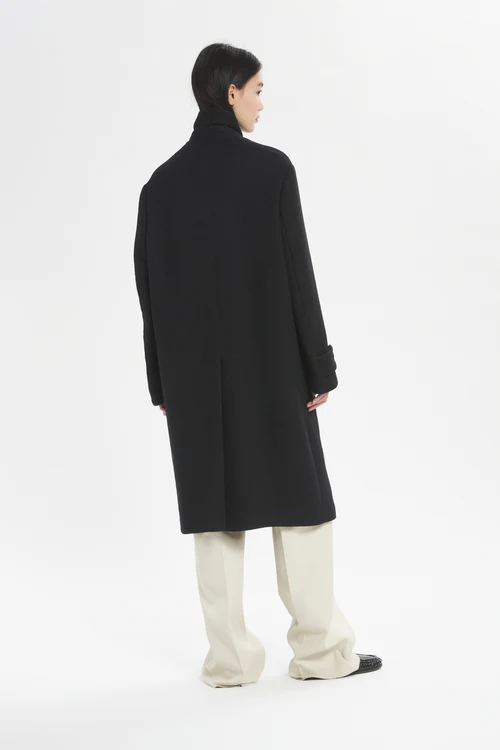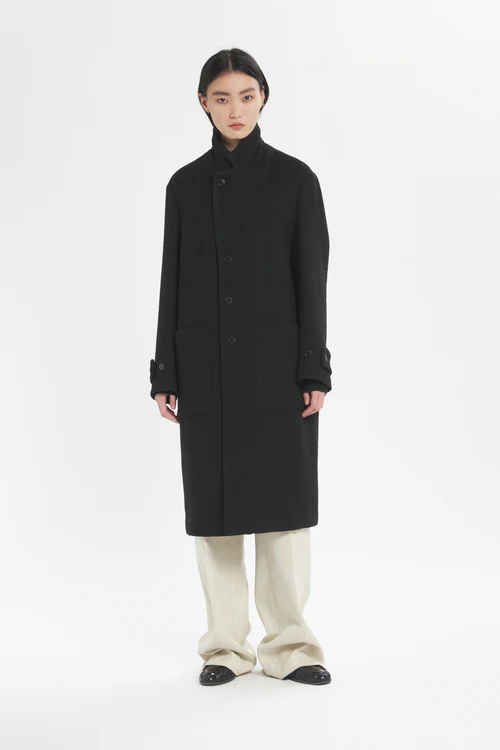 • Military-inspired coat with a clean silhouette, dropped shoulders, and a striking length below the knee