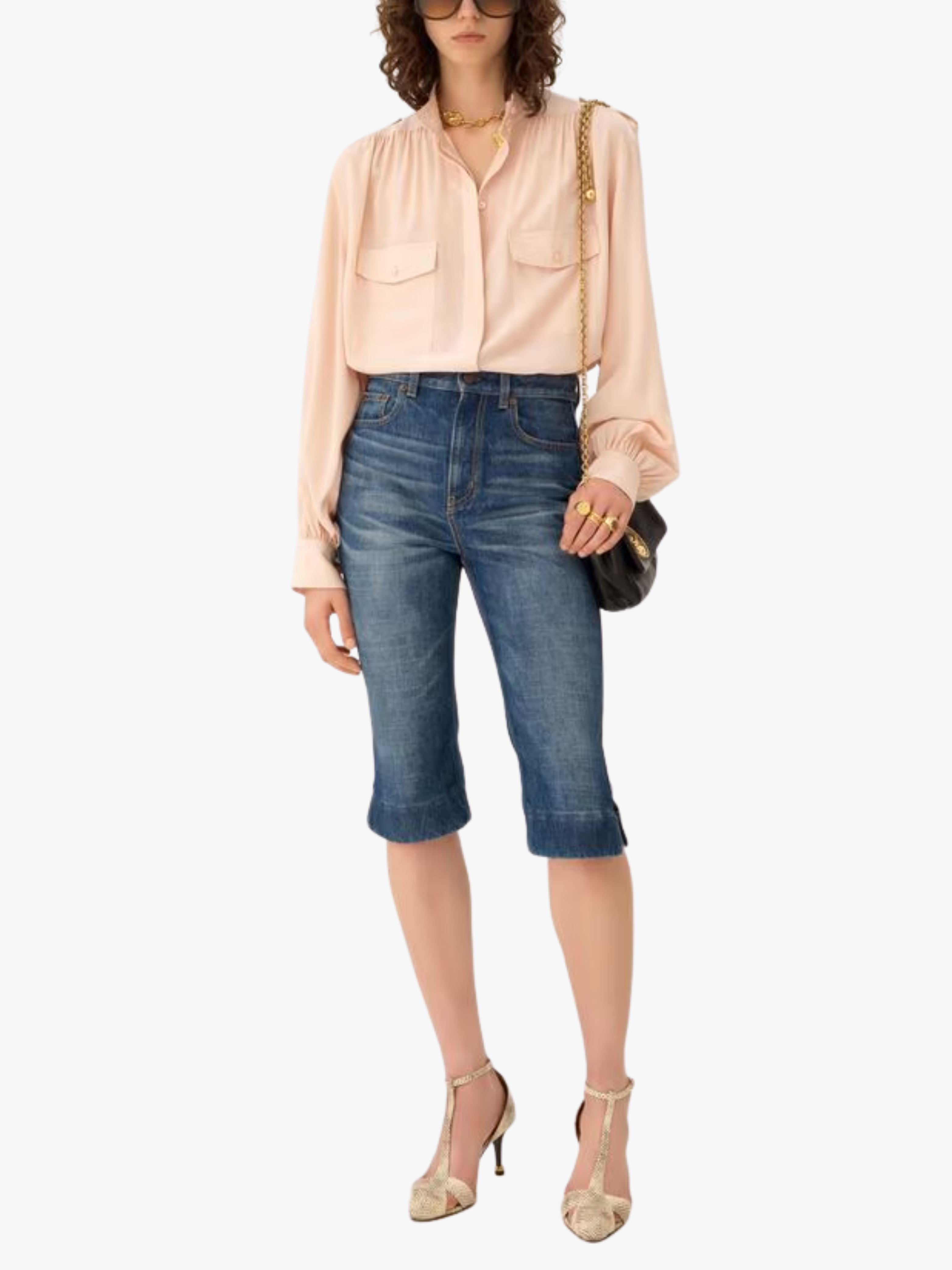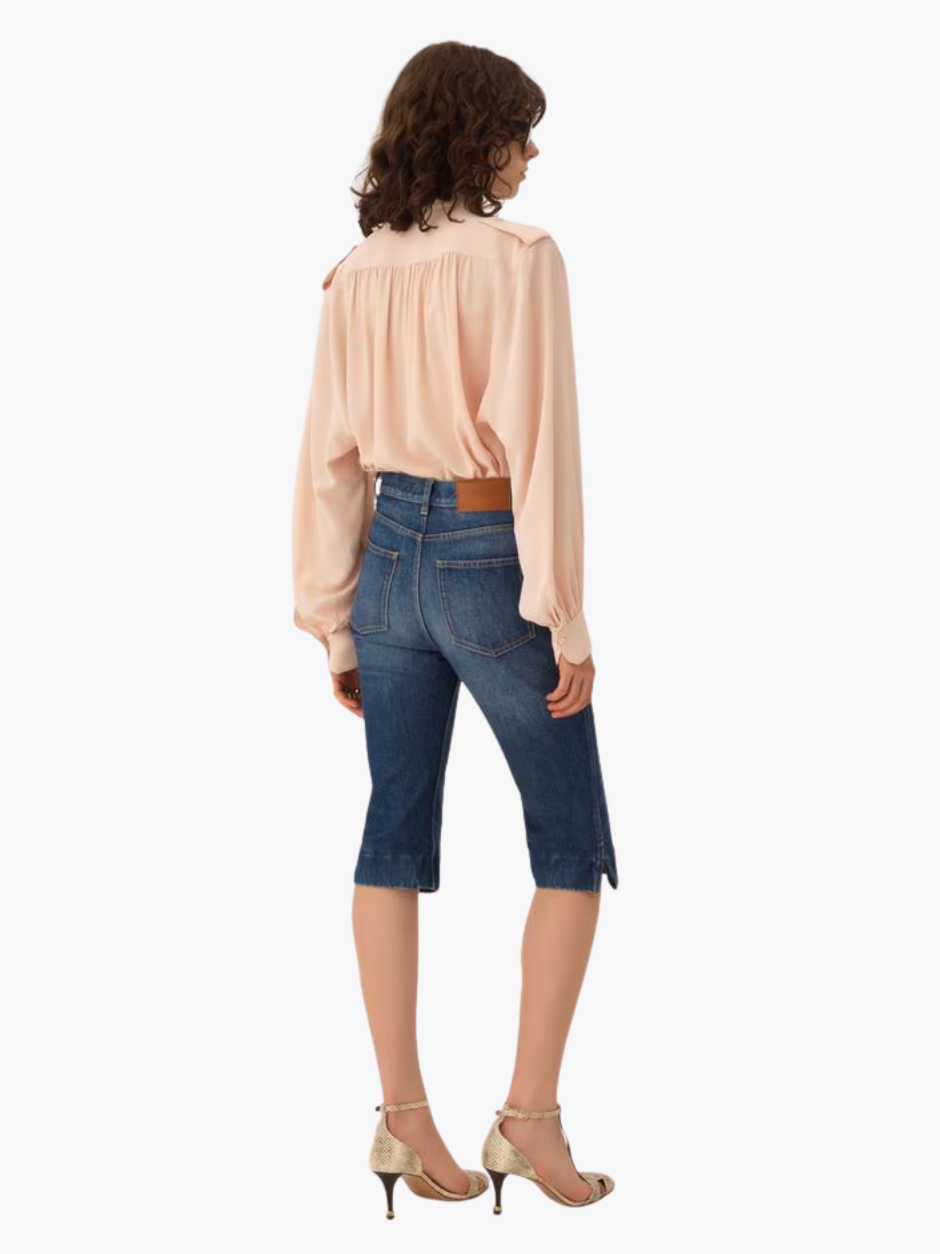 • High-neck blouse made from organic silk crêpe de chine with a fluid, feminine silhouette.