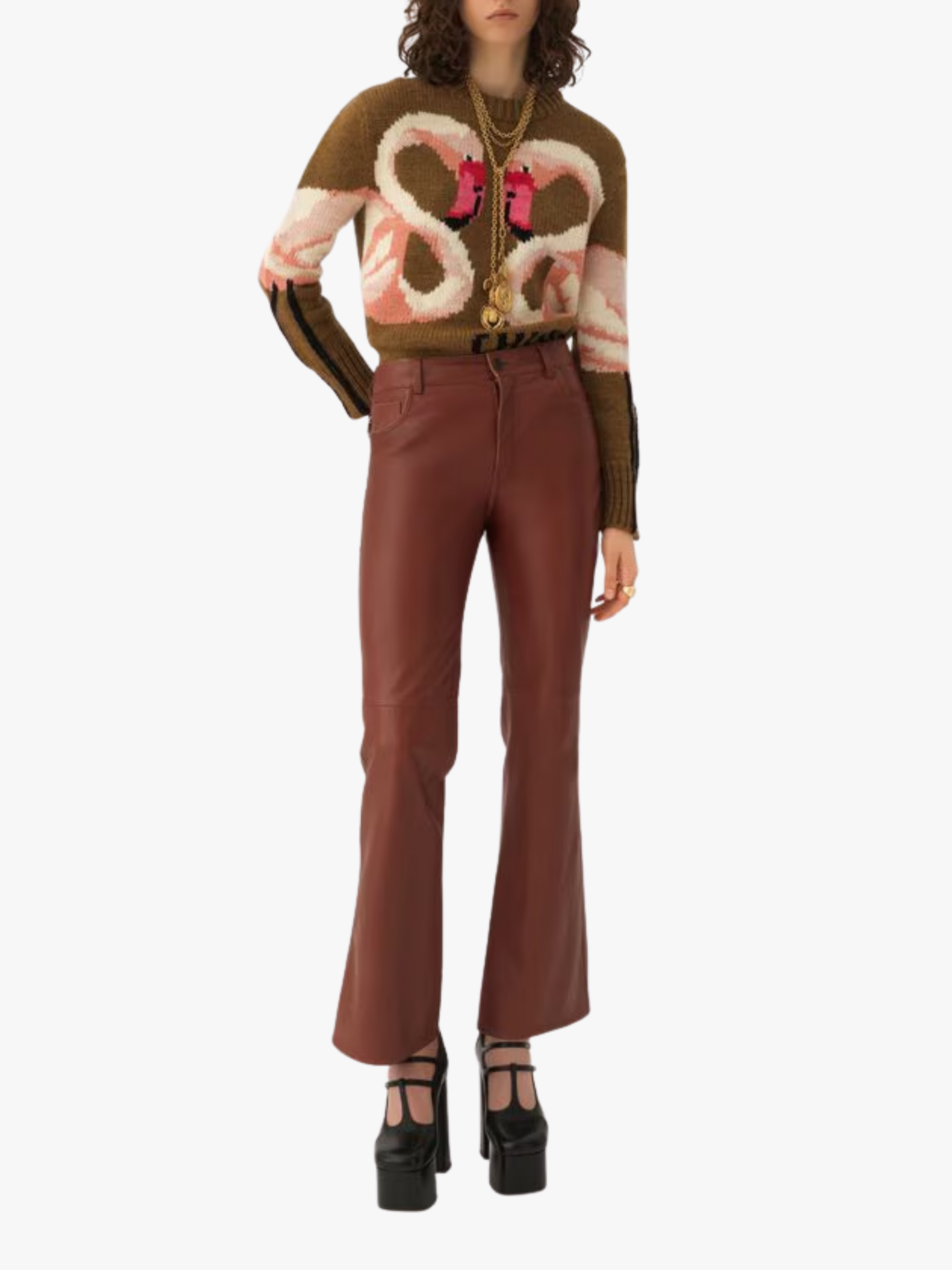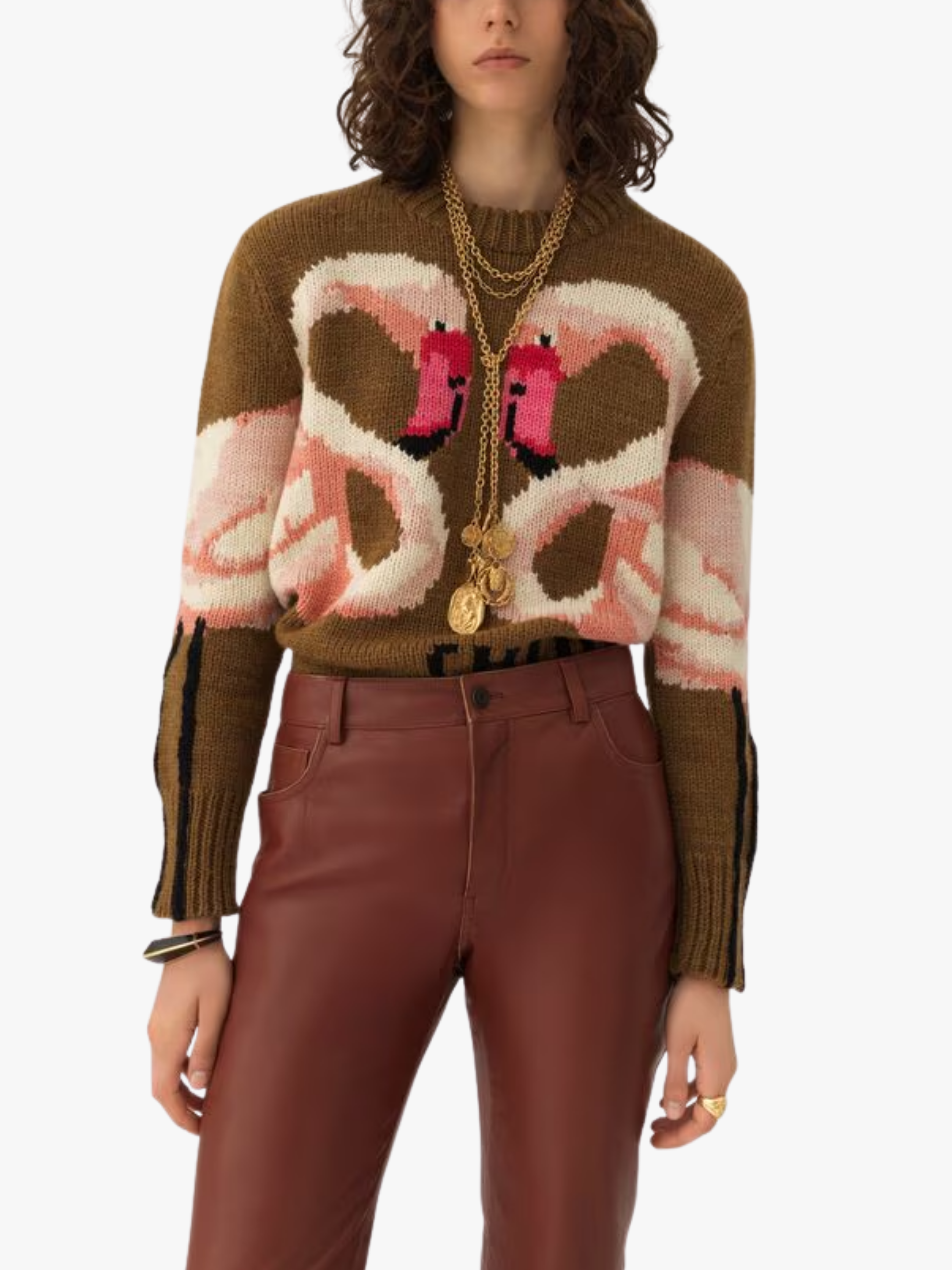 • Knit‑in two flamingos motif and large Chloé logo embroidery at the hem as signature design details.