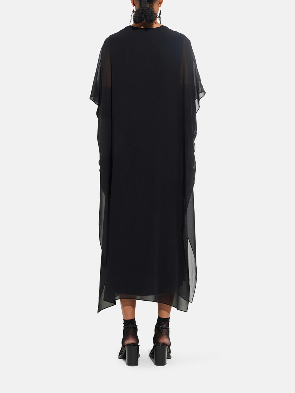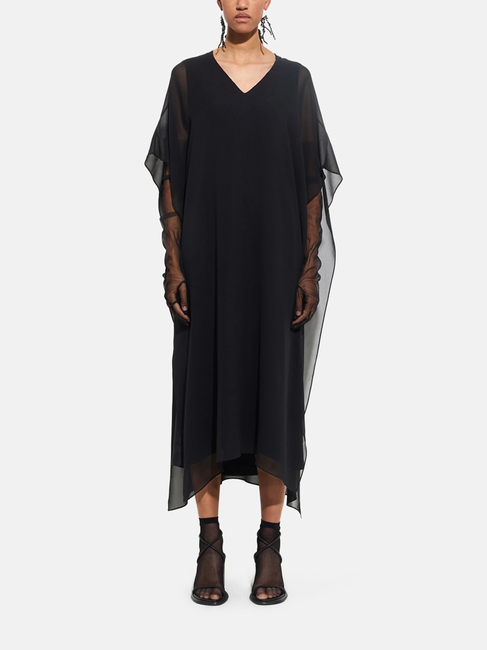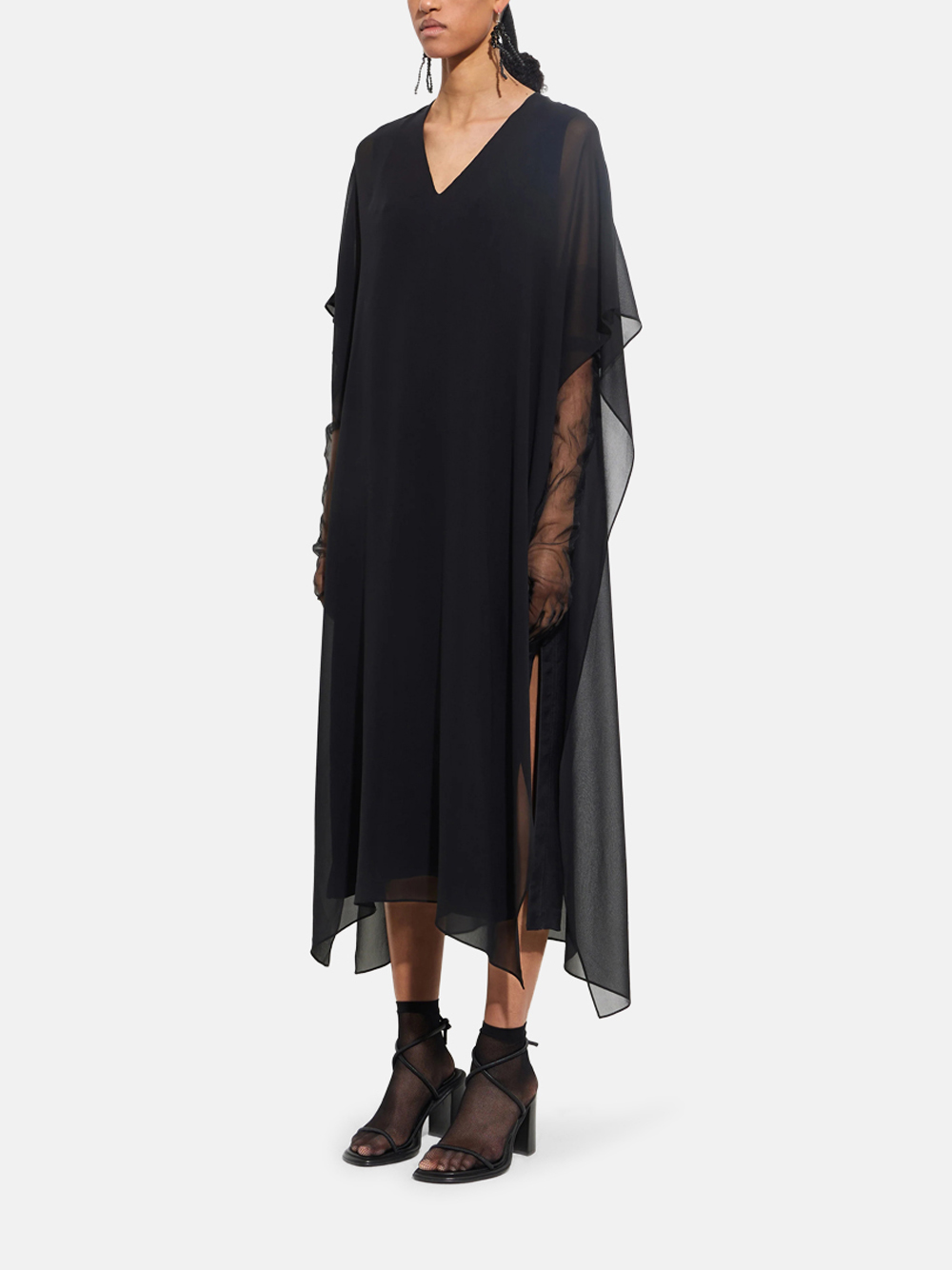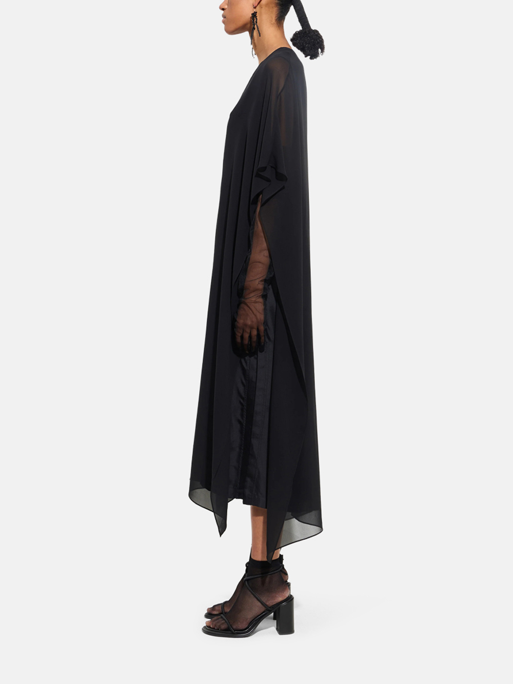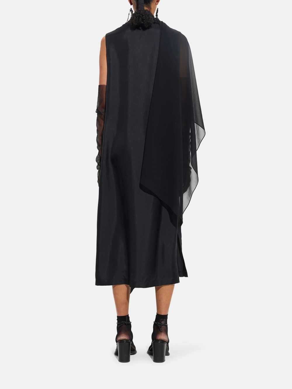 • Cape overlay: The overlay can be worn in different ways—with the V-neck at the front for a clean, elegant look, or turned around for a more dramatic effect.