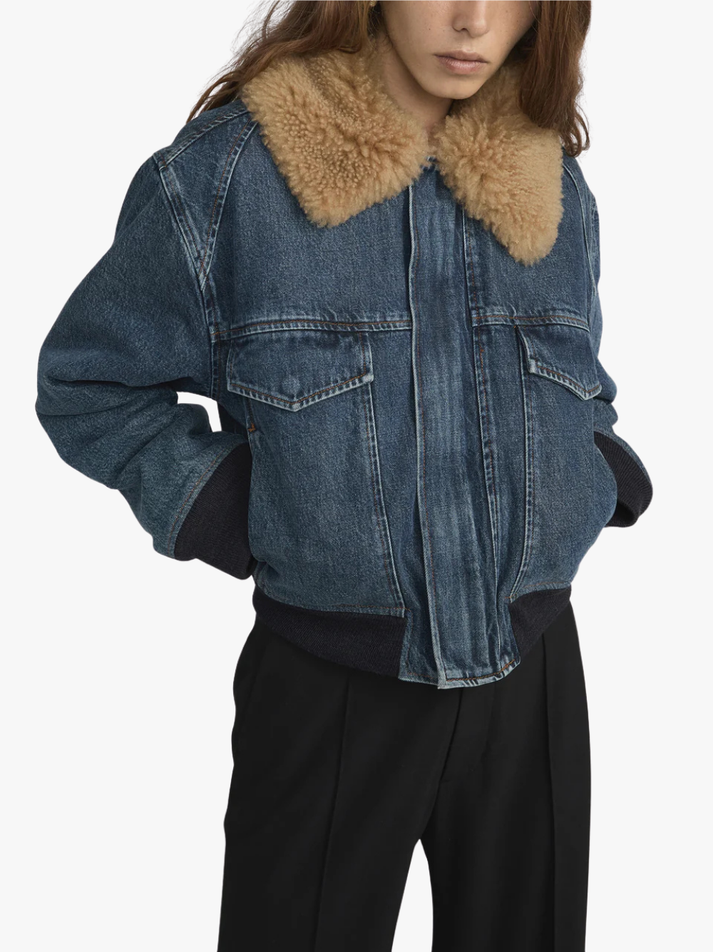 - Denim bomber jacket with a soft, 100% plush shearling collar