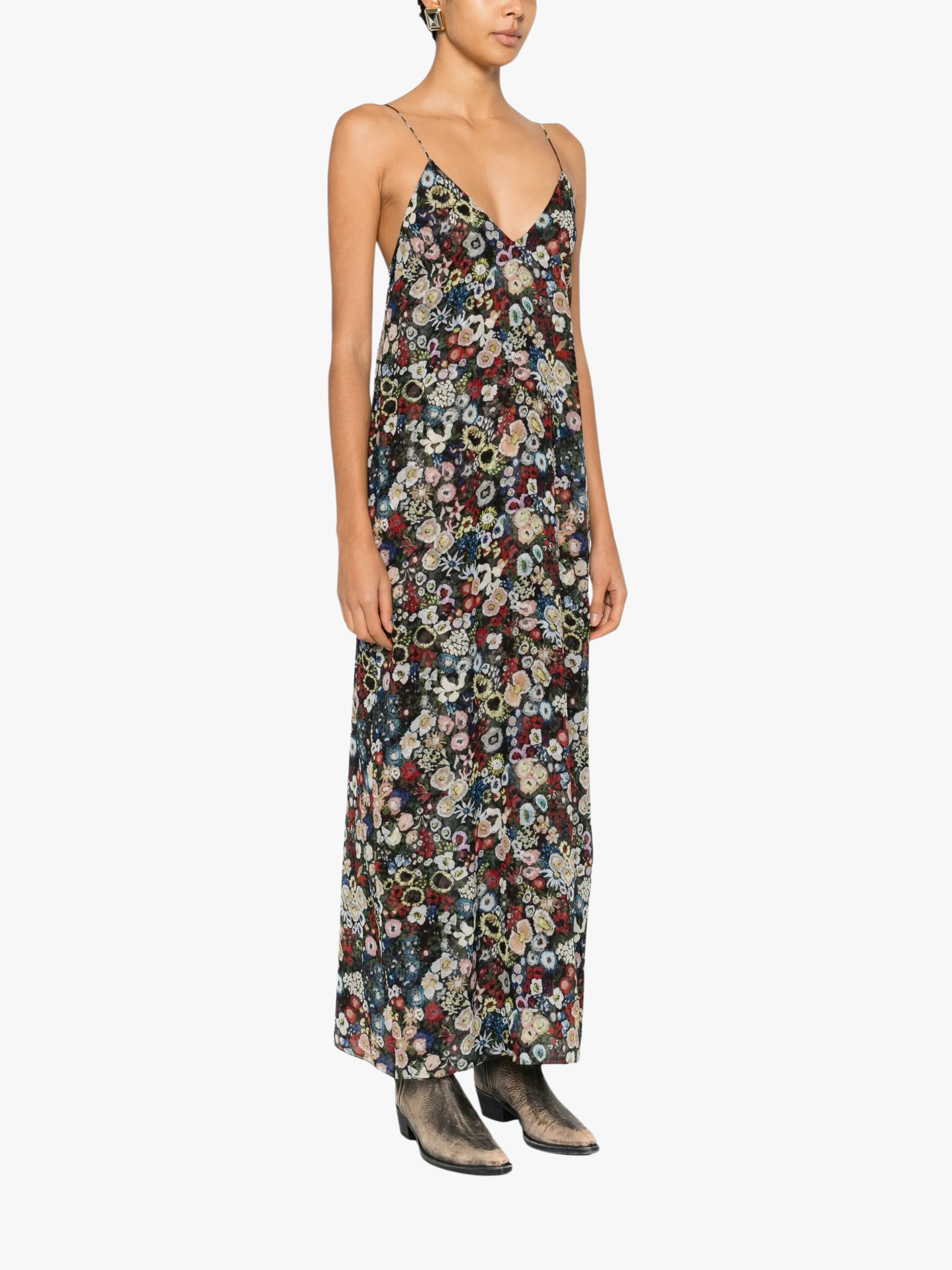 • Midi dress with an elegant V-neckline and thin spaghetti straps — feminine silhouette and summer-ready styling.
