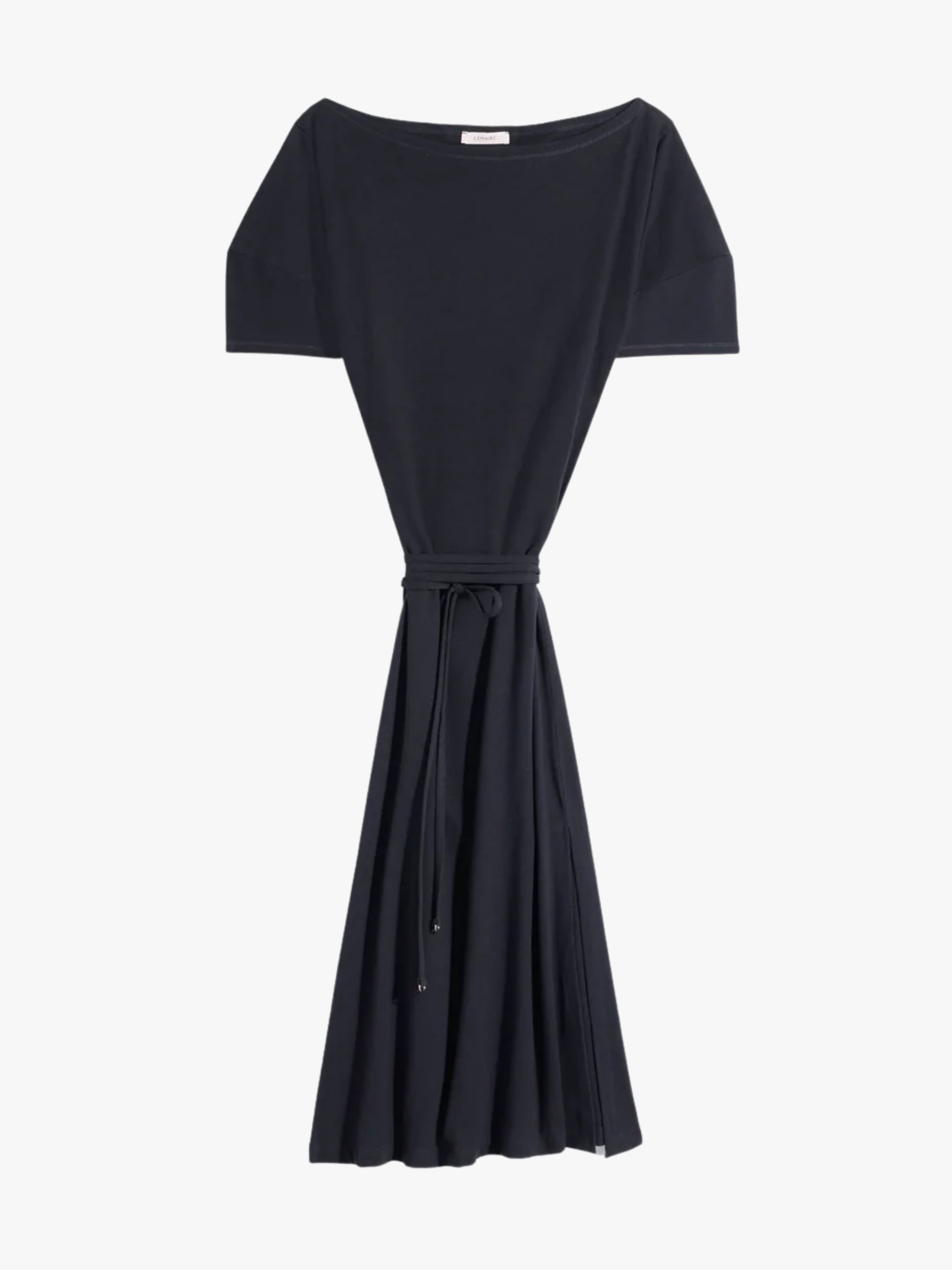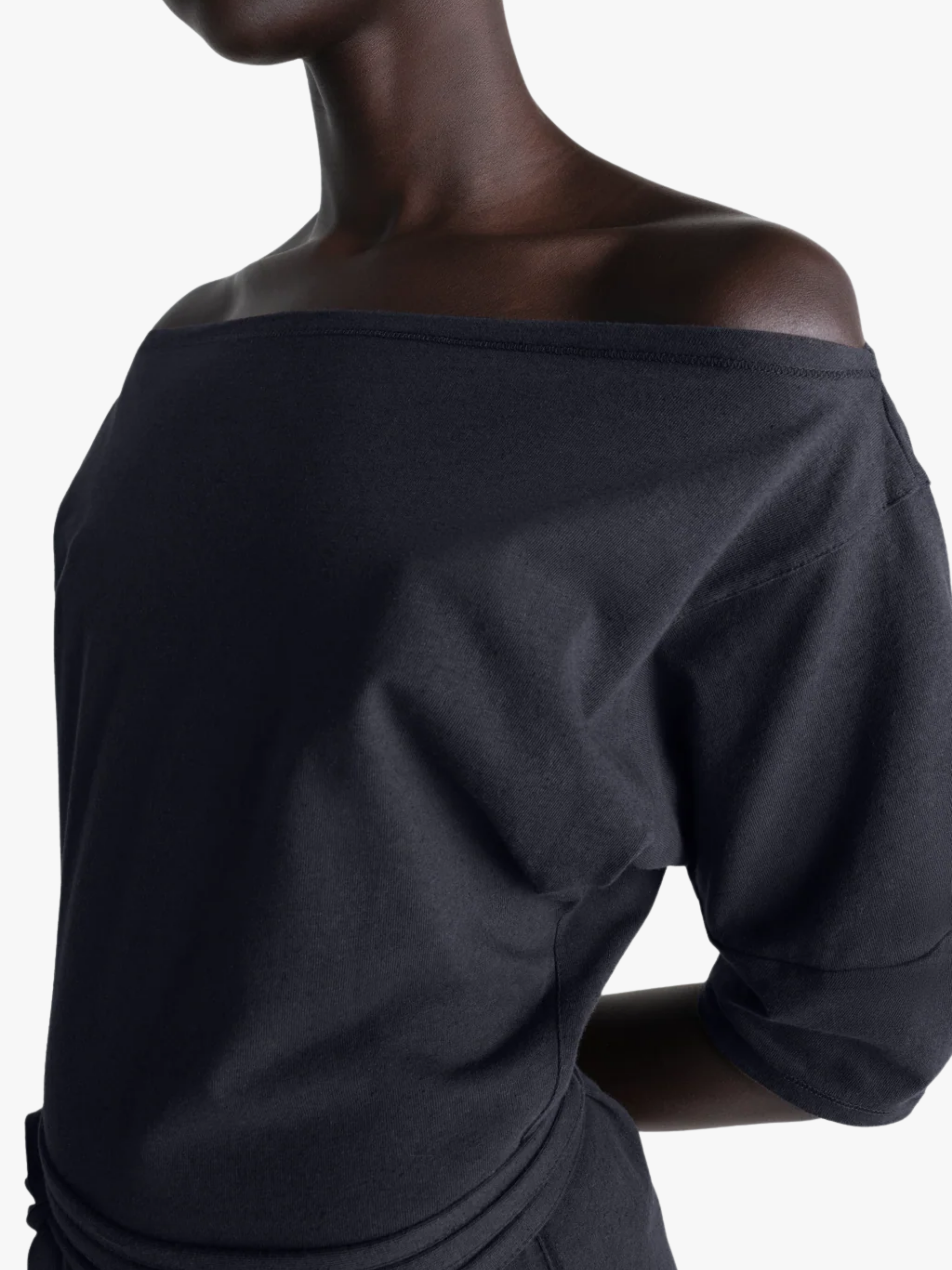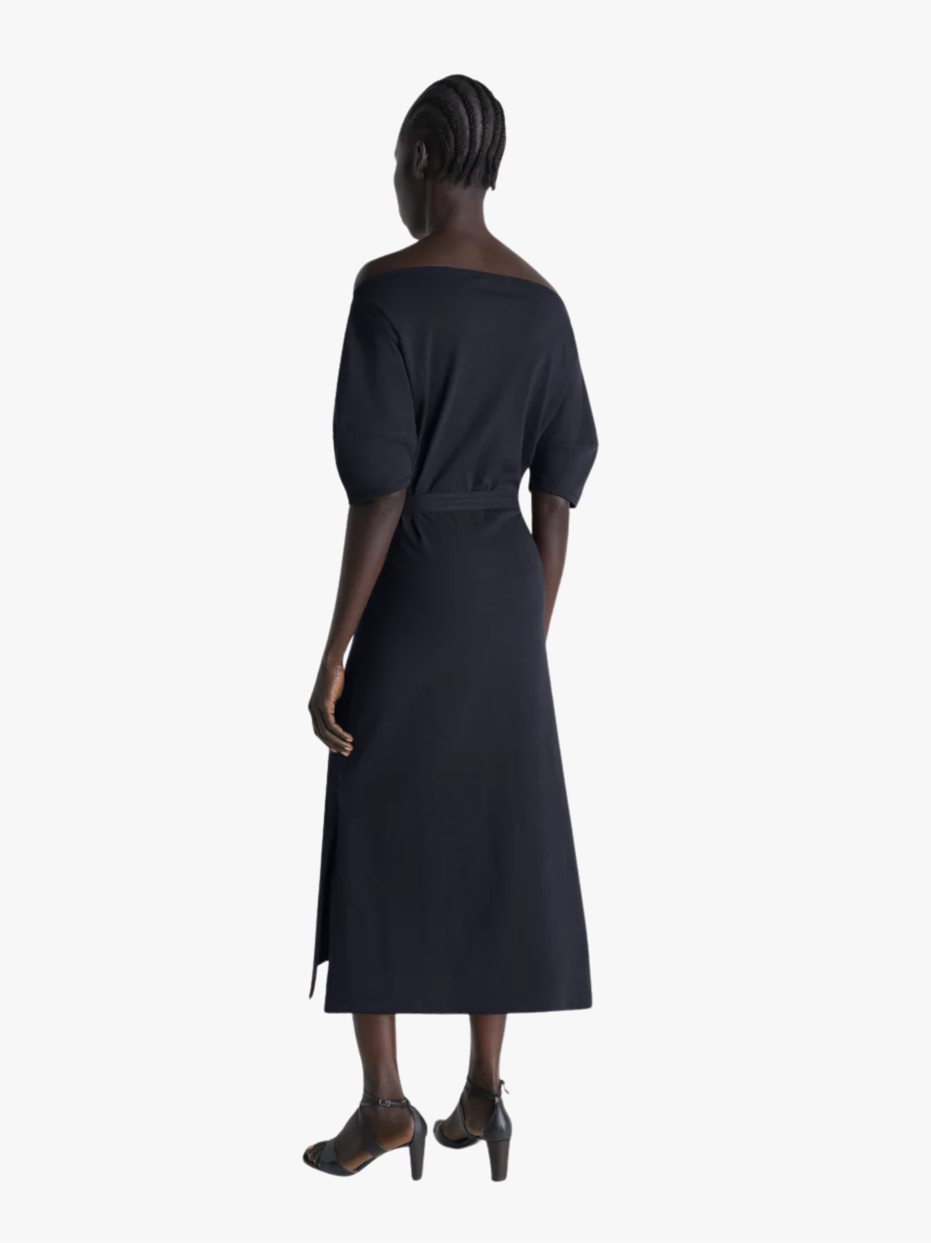 • Off-shoulder dress in heavy cotton linen jersey with open shoulders for a modern, feminine silhouette