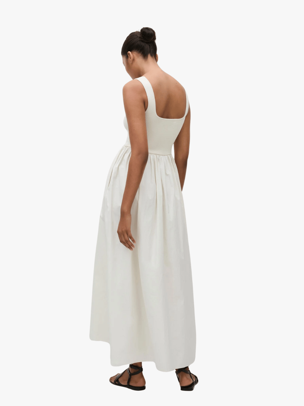 • A combination of a fitted knit top and a voluminous cotton poplin skirt for a feminine silhouette.