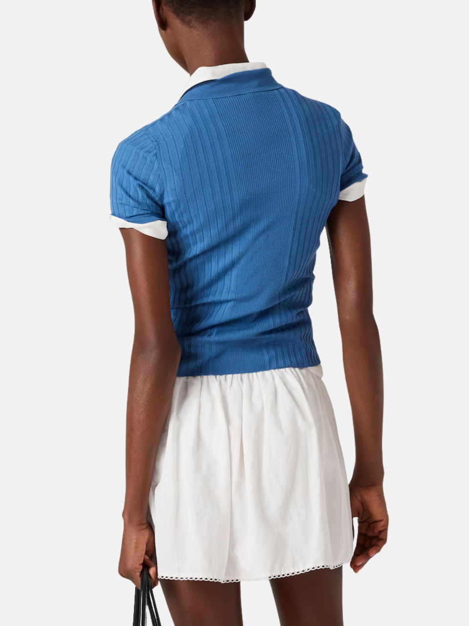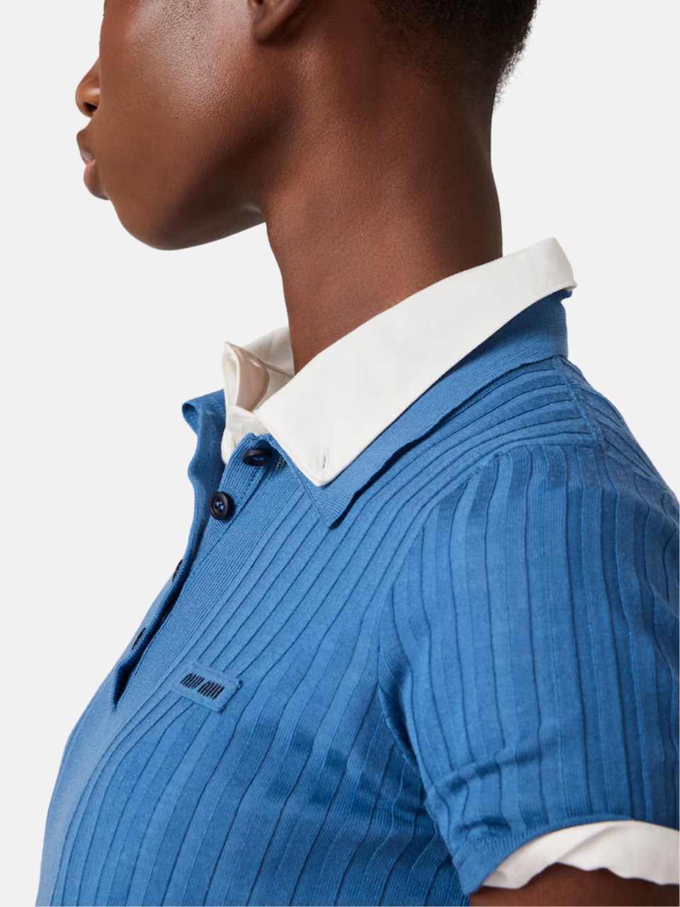 The Ribbed Knit Wool Polo Shirt by Miu Miu in blue with the following features:
