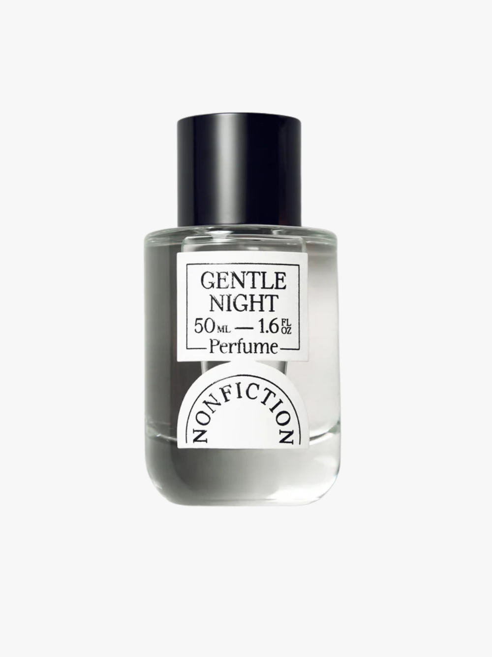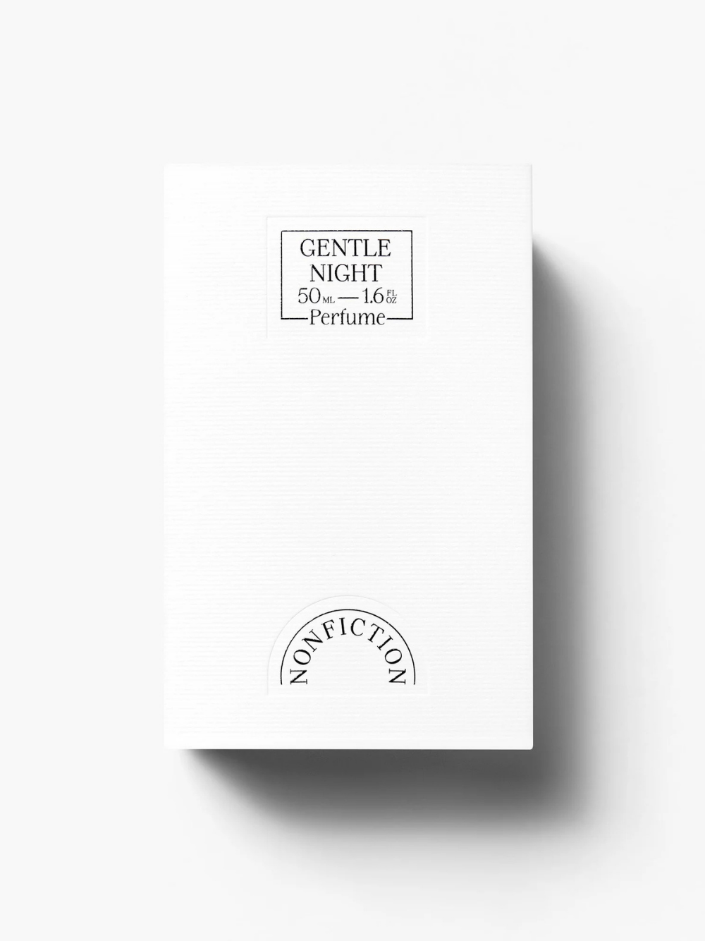 Perfume "Gentle Night" from Nonfiction featuring subtle equilibrium of boldness and sweetness, transparent top note of green tea and sweet flowers metamorphose into simple and straight forward touch of suede, moss and cedarwood, and then finishes with the shade of mild vanilla and musk.