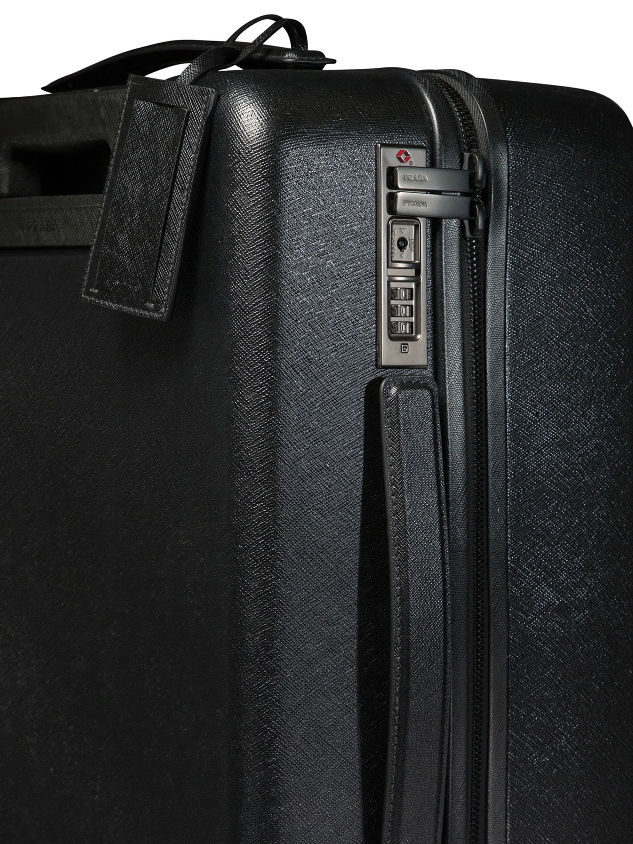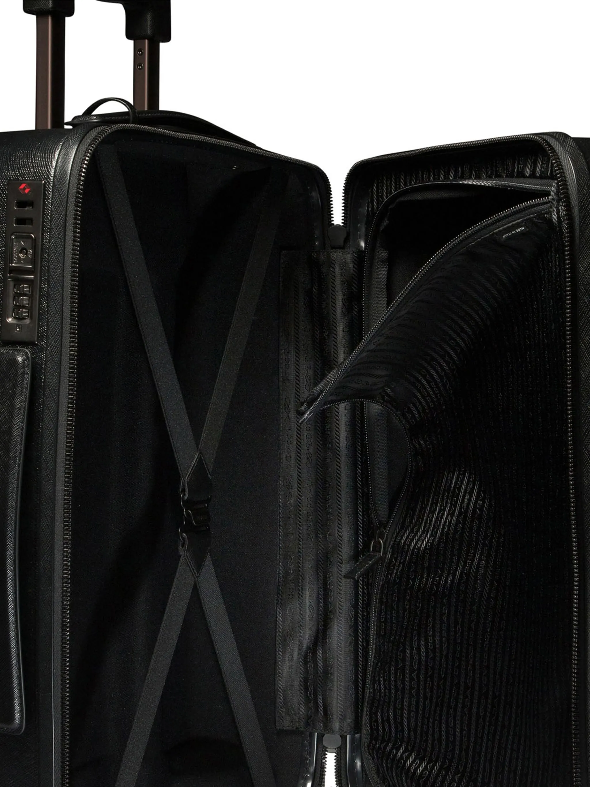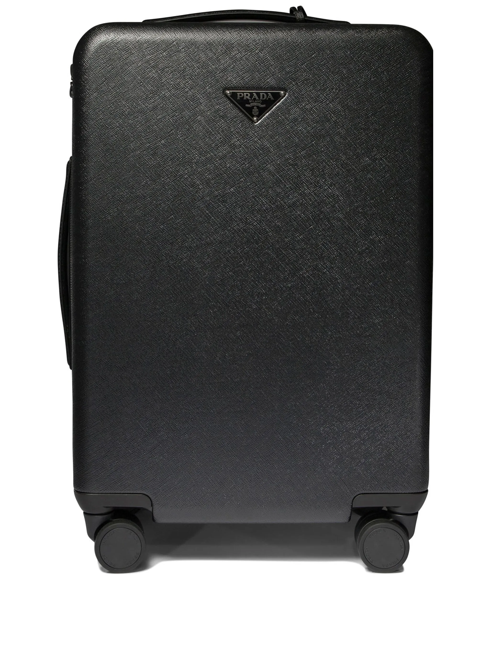 Suitcase by Prada with the following features: black, leather, triangle logo, extendable handle, narrow handle, all-round zipper, main compartment, zipper pocket inside, elastic inner strap, combination lock, four wheels. Manufacturer: Prada S.p.A., Via Antonio Fogazzaro, 28 20135 Milan, Italia, corporatepress@prada.com