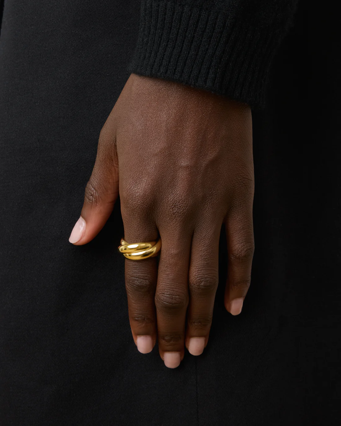 The Sofie ring by LIÉ STUDIO featuring: 18-carat gold-plated sterling silver, twisted silhouette, width: 1.1 cm, weight: 18 g, engraved with "LIÉ STUDIO".