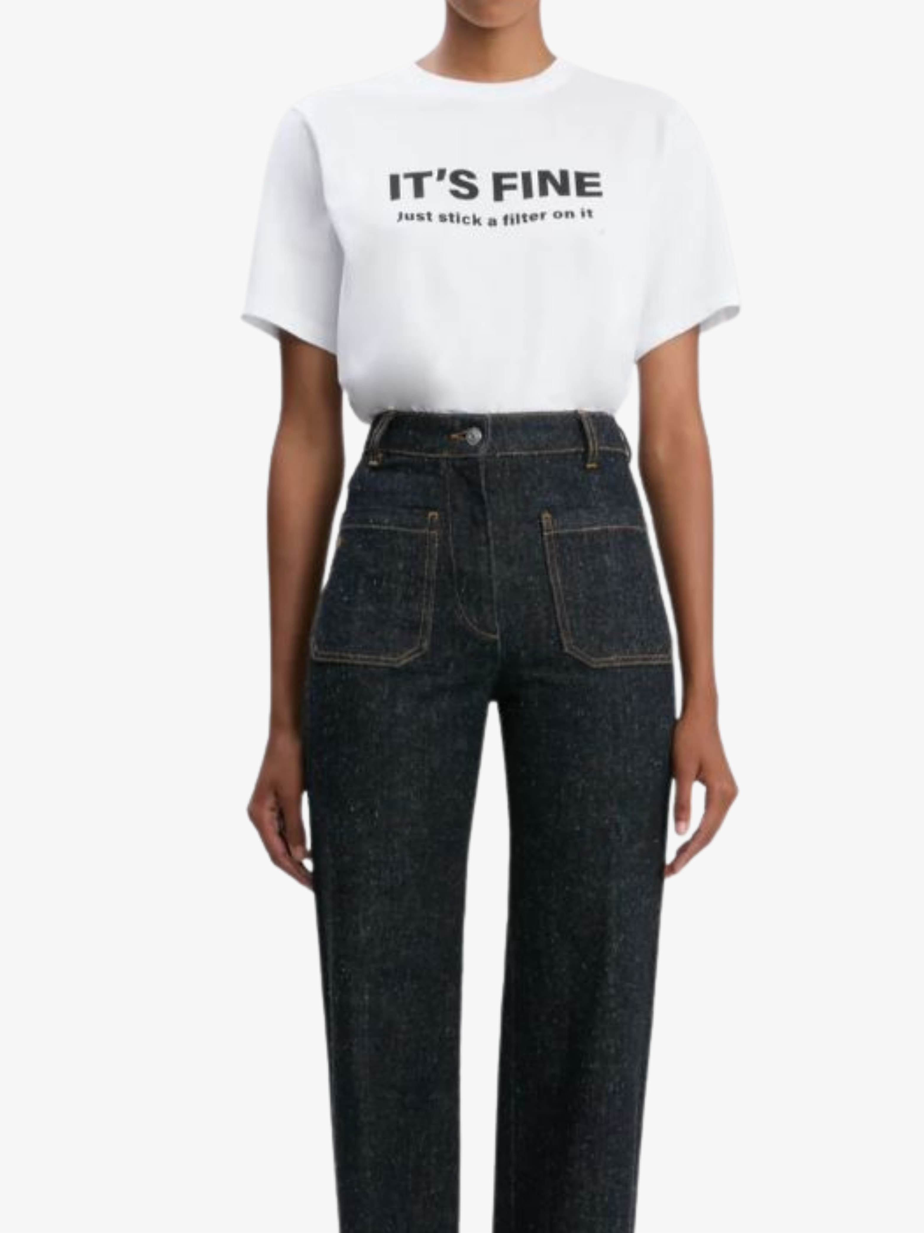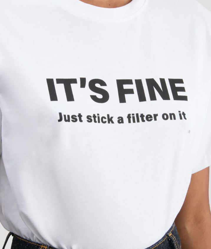 • Front slogan “It’s Fine, Just Stick A Filter On It” — playful, tongue-in-cheek graphic.