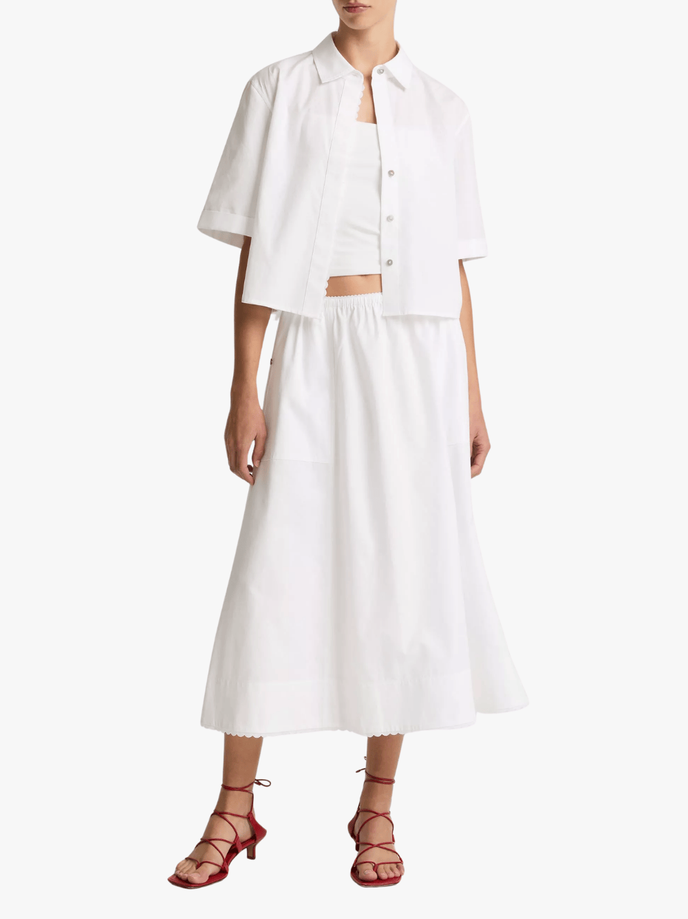 This white cotton blouse with scallop detail and button placket from Vince features: