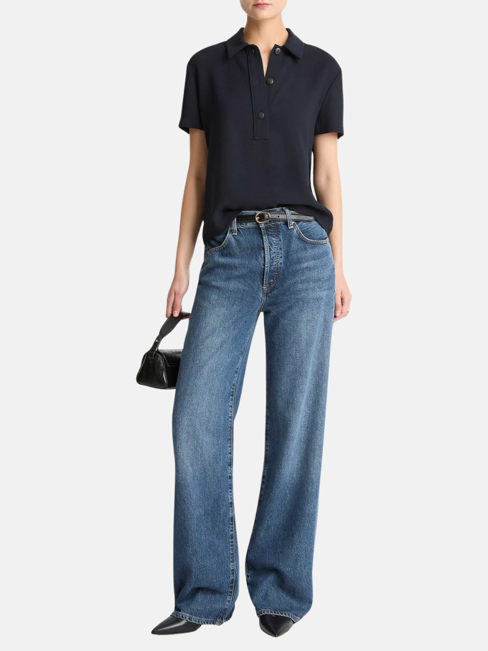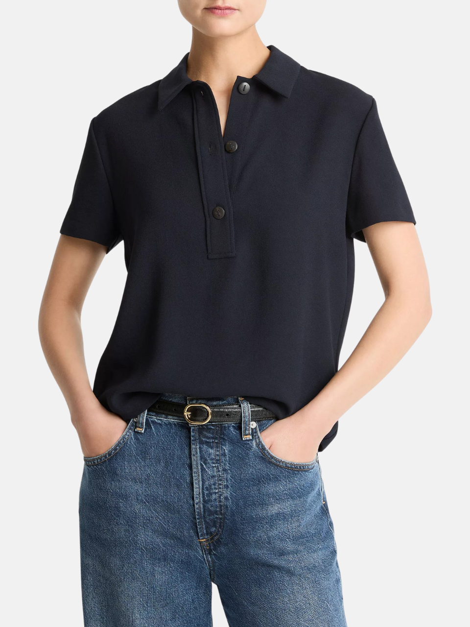 The Crepe Polo Shirt in blue by Vince features the following characteristics: