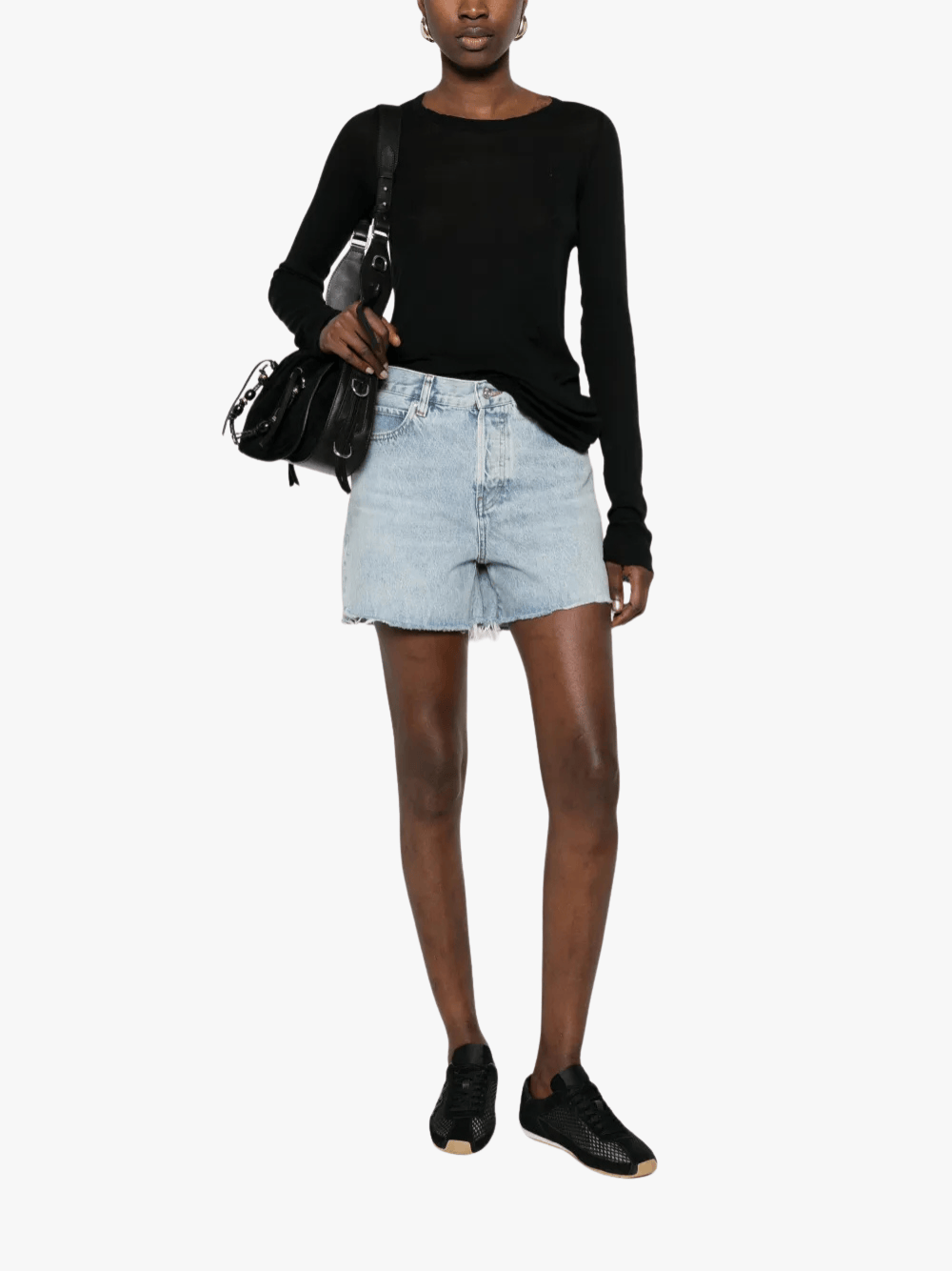 • High‑Waist‑Shorts aus klassischem Denim mit leicht ausgefranstem Saum für einen lässigen, modernen Look.