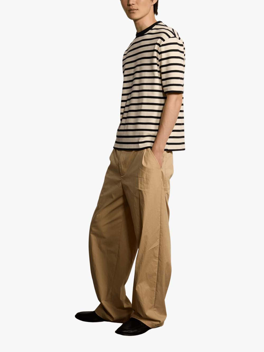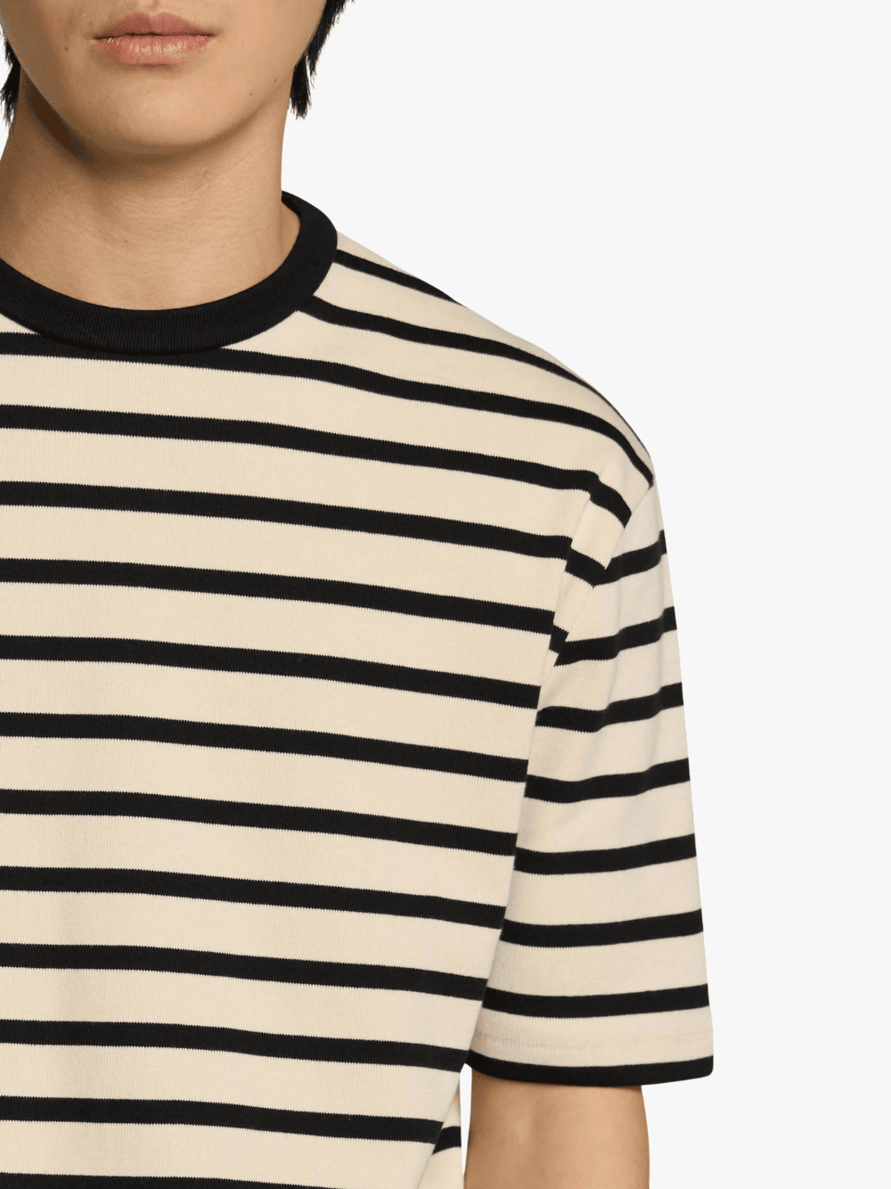• Cleanes Streifendessin kombiniert mit einem kontrastierenden Rundhalsausschnitt für einen modernen Akzent.