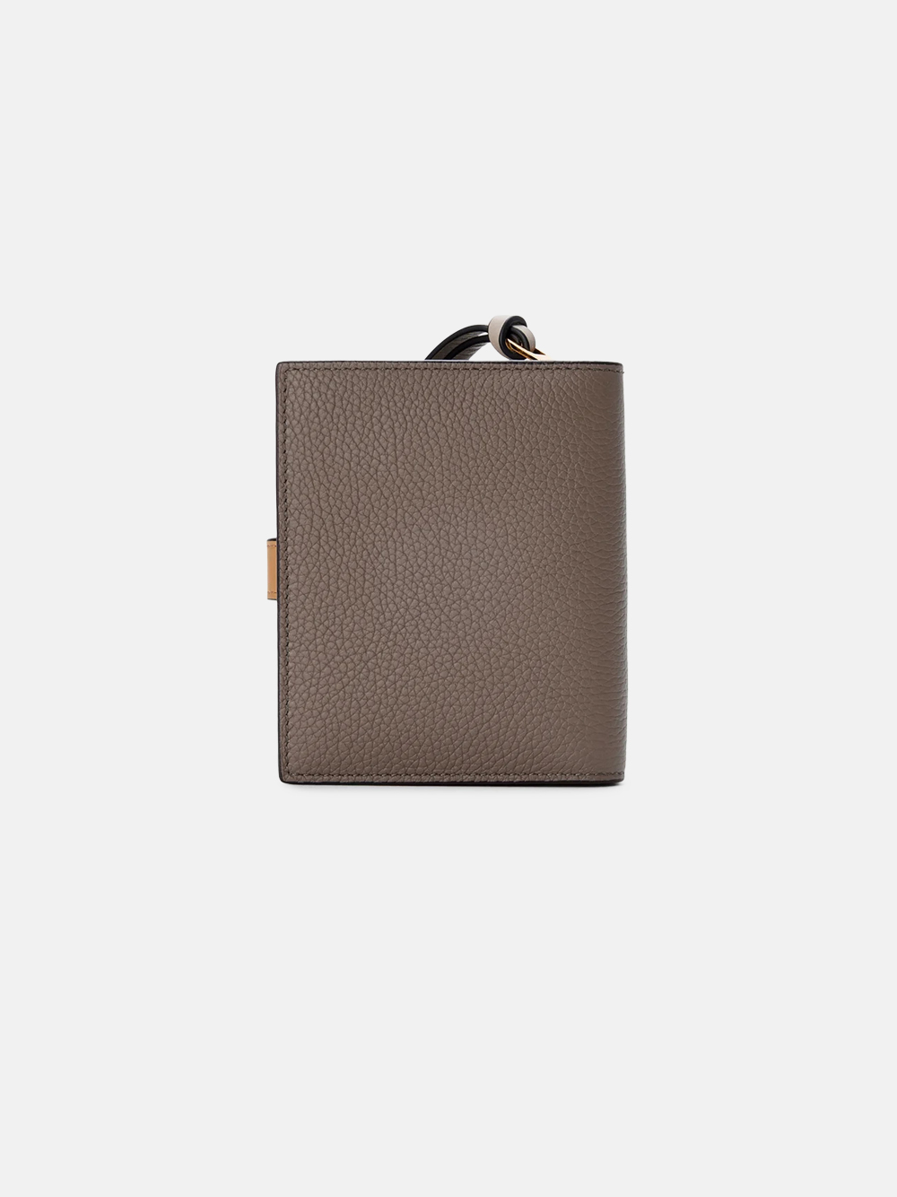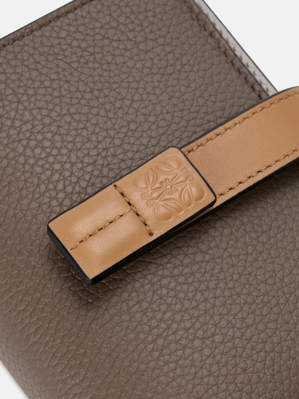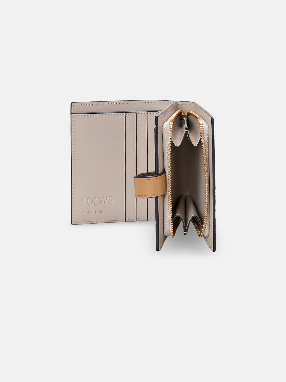 Die kompakte Brieftasche mit Reißverschluss in Taupe/Gold aus weichem Kalbsleder von Loewe mit folgenden Merkmalen: