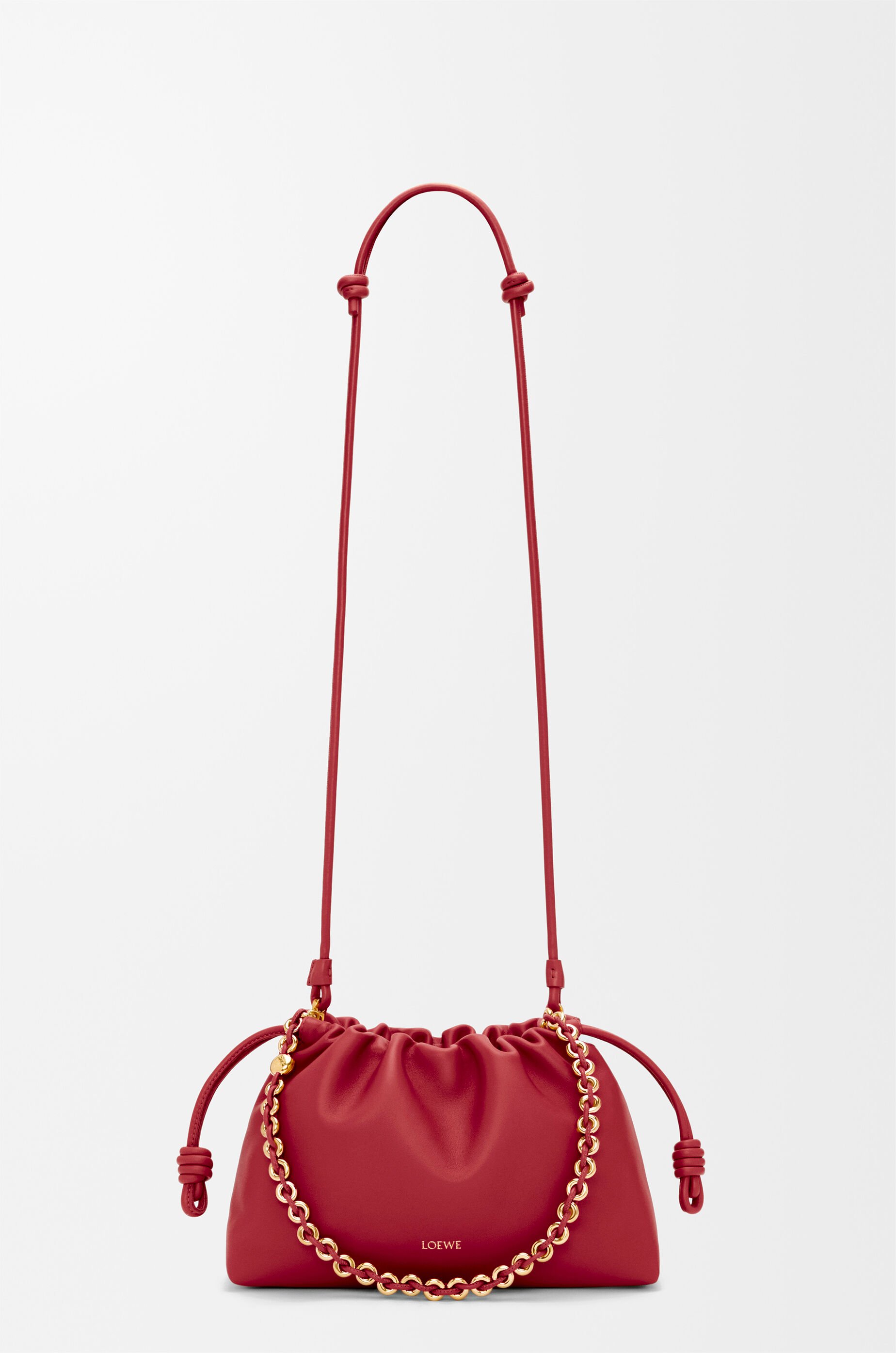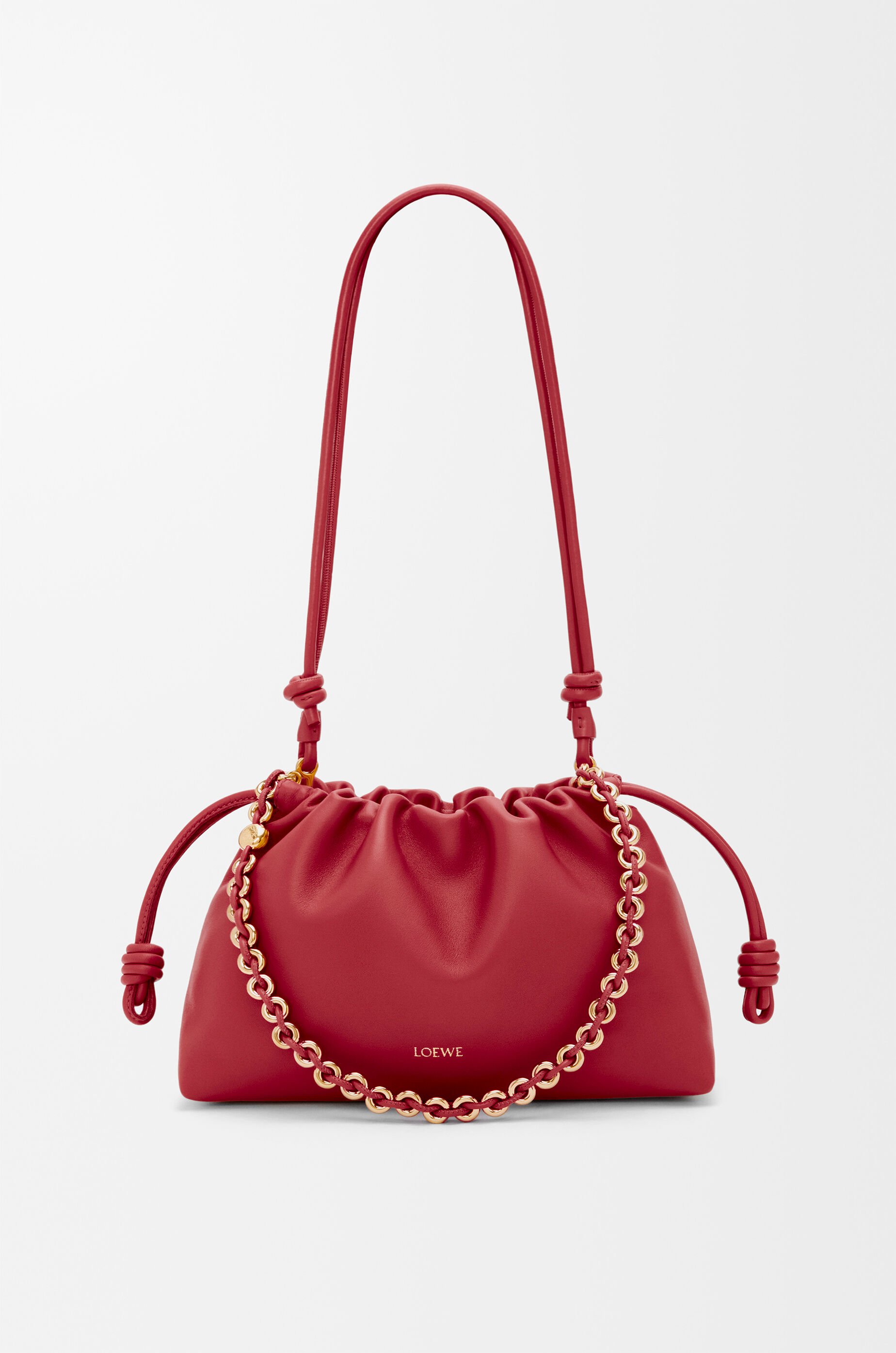 Die Flamenco Tasche von Loewe zeichnet sich durch ein gerafftes Design aus, das durch die charakteristischen Knoten an den Seiten ergänzt wird. Diese mittelgroße Versionhat folgende Eigenschaften: Sirupfarben, Lammnappa, Über der Schulter, als Umhängetasche oder am oberen Henkel zu tragen, Abnehmbarer und verstellbarer Lederriemen, Abnehmbare Donut Kette mit Anagram Pebble, Magnetverschluss, Wildlederfutter, Goldene oder silberne LOEWE Prägung. Hersteller: Loewe S.A., Calle Goya 4, 28001 Madrid, Spain; e-mail: clientservices_eu@loewe.com.