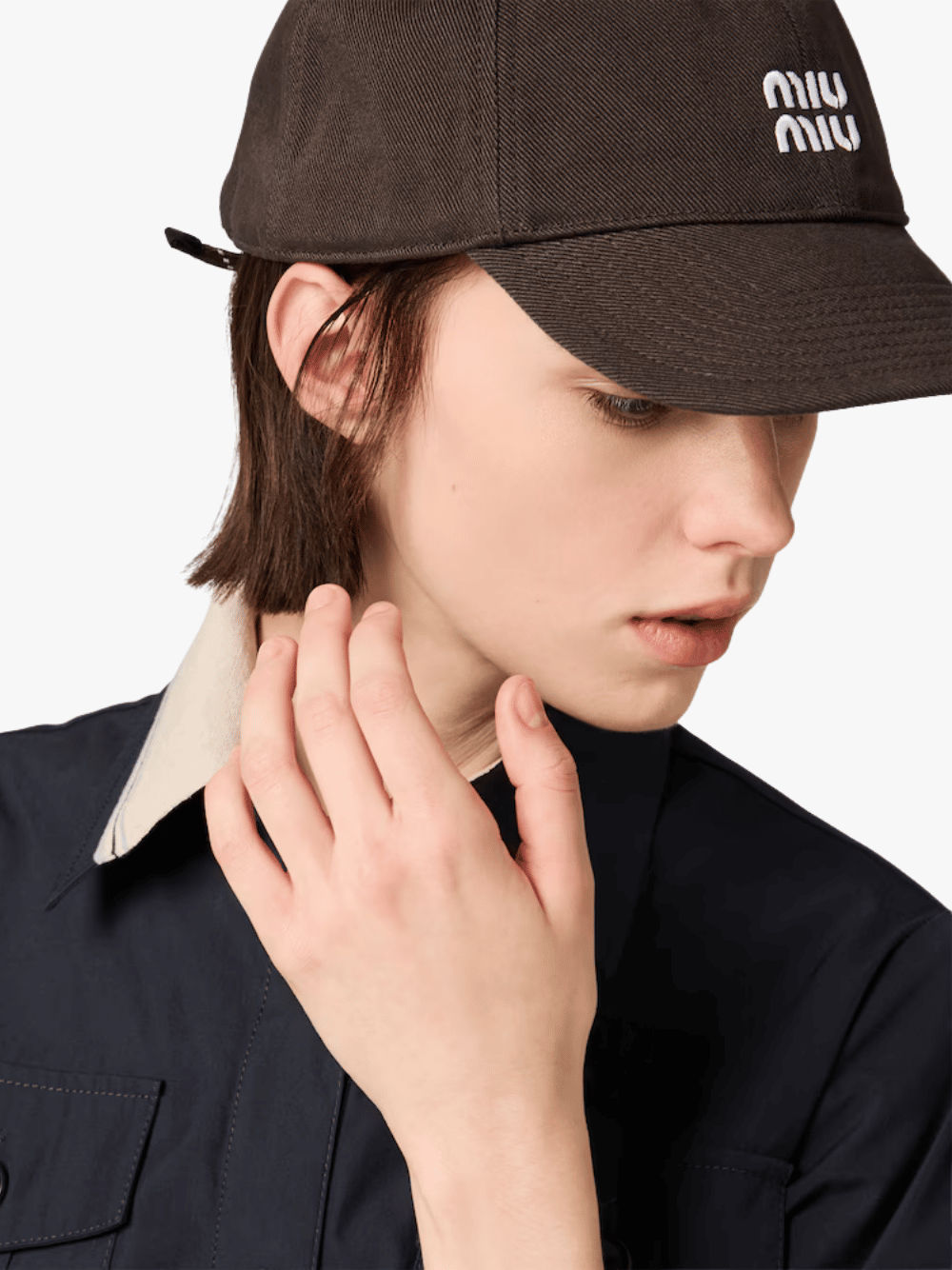 Die Baseballkappe aus Denim in Dunkelbraun von Miu Miu mit folgenden Merkmalen: