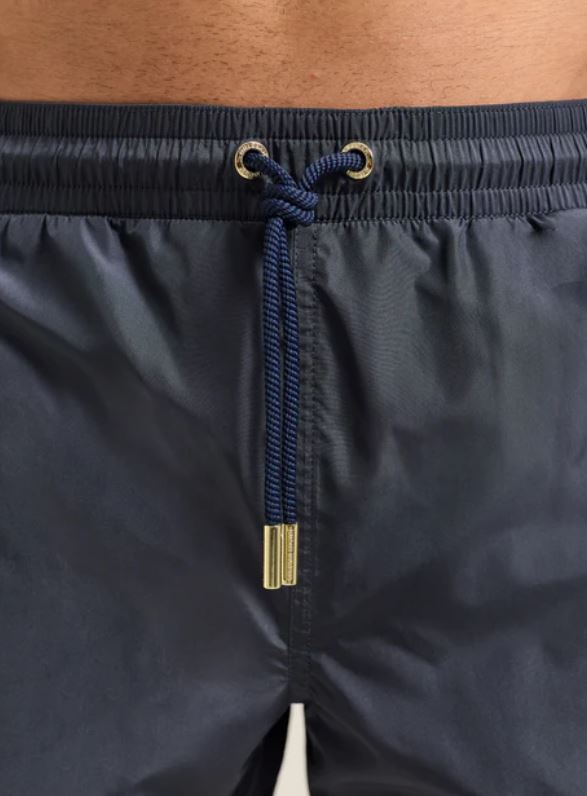 • Klassische Mid‑Length Badeshorts mit zeitgemäßem, etwas längerem Bein für elegantes Resort‑ und Strand‑Styling.
