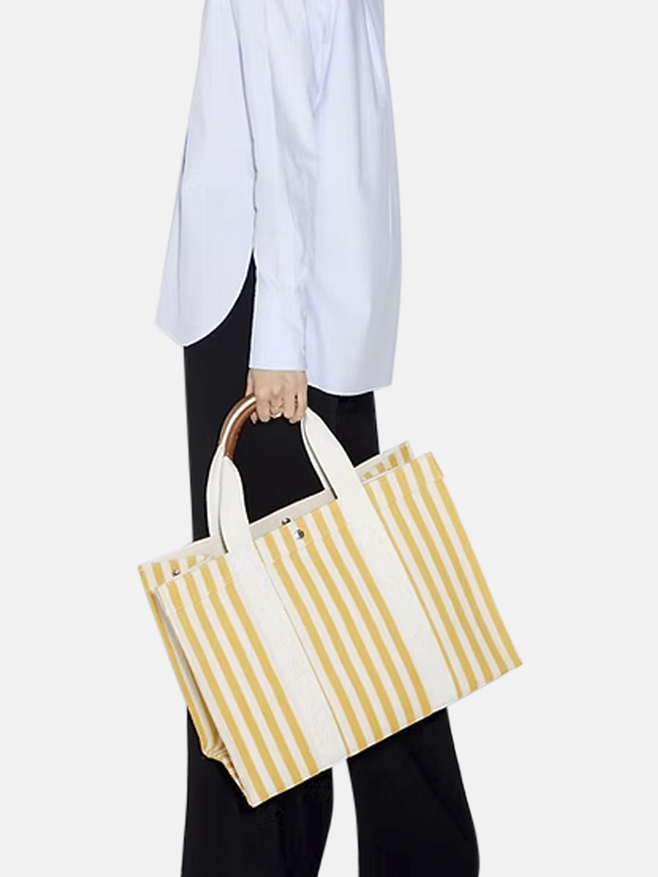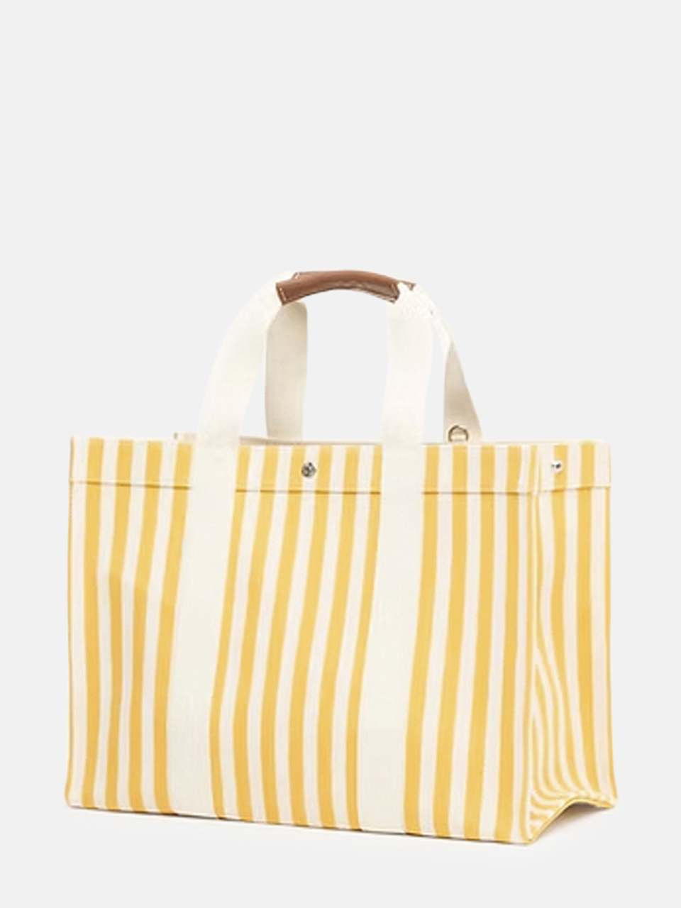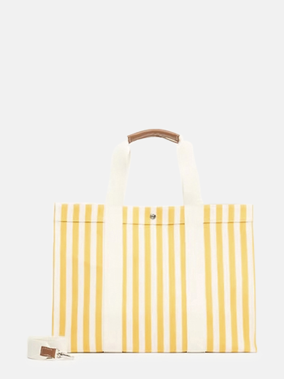 TOTE XL - Gelbes Palais Royal von Ruedeverneuil mit folgenden Eigenschaften: Extra große Tasche aus Baumwollstoff mit gelben und weißen vertikalen Streifen, weißem Seilriemen und Lederbesätzen in Kamel. Hersteller: Rue de Verneuil, 11 Rue de Verneuil, 75007 Paris, Frankreich, Phone: +33 1 40 15 90 90, Email: contact@ruedeverneuil.com