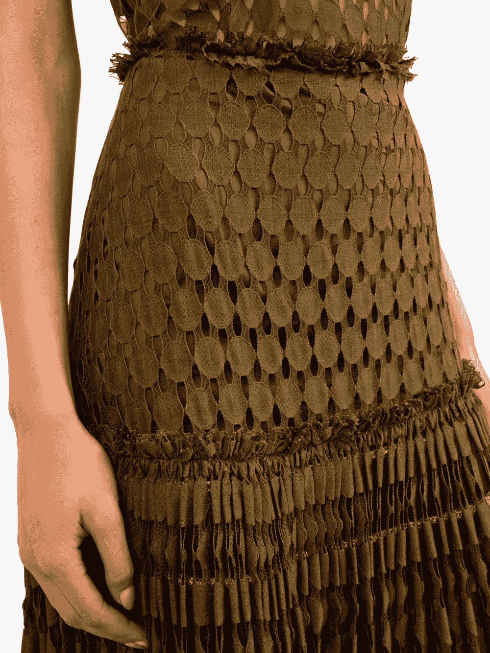 • Interpretative Spitzenverarbeitung inspiriert von traditioneller Alençon‑Nadelspitze, mit geometrischem, kunstvoll durchbrochenem Muster, das bei Bewegung elegant zur Geltung kommt.