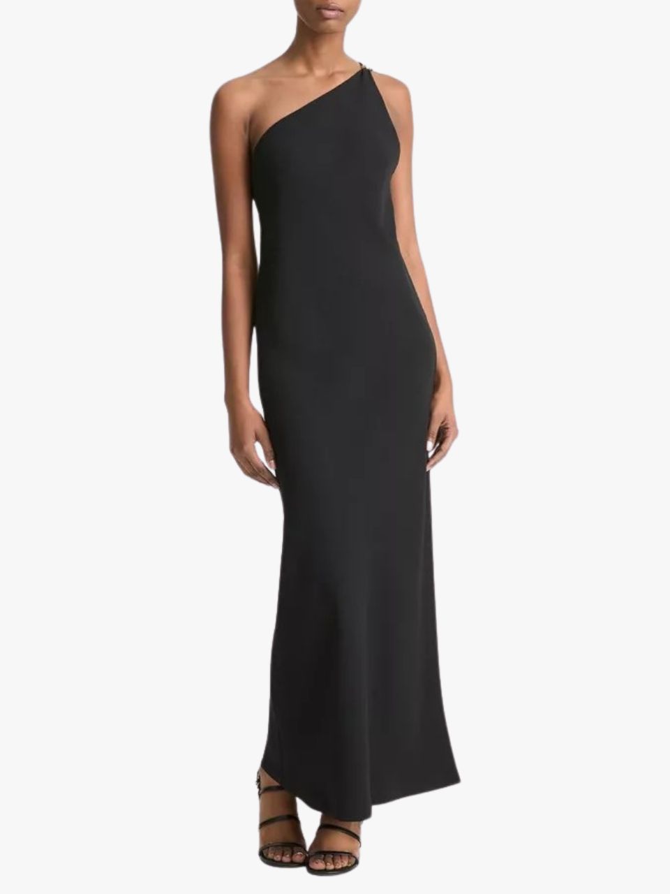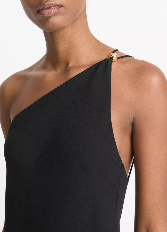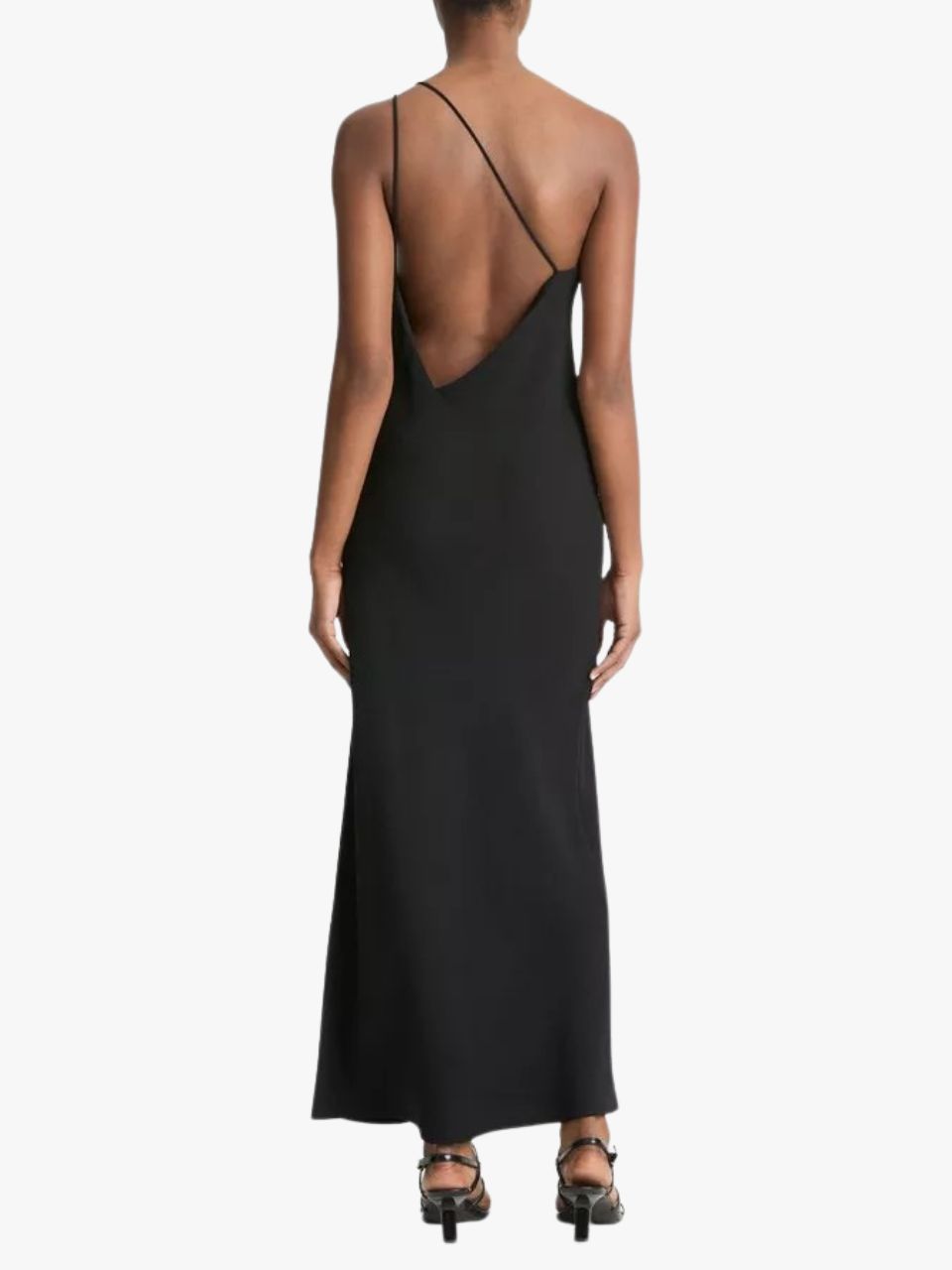 Kleid von Vince mit folgenden Eigenschaften: Schrägschnitt, offener Rücken, schmale asymmetrische Träger, goldfarbene Metallkugel, zum Hineinschlüpfen, Seitenschlitz.