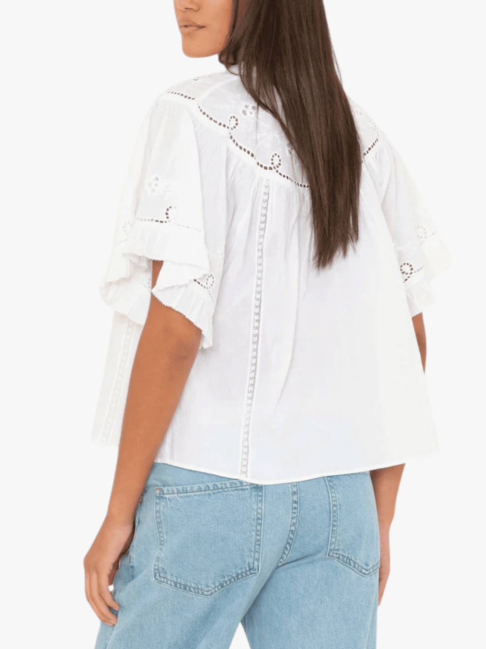 • Aufwändige Stick‑ und Spitzenleisten‑Details an Ärmel und Vorderteil für eine zarte, dekorative Optik.