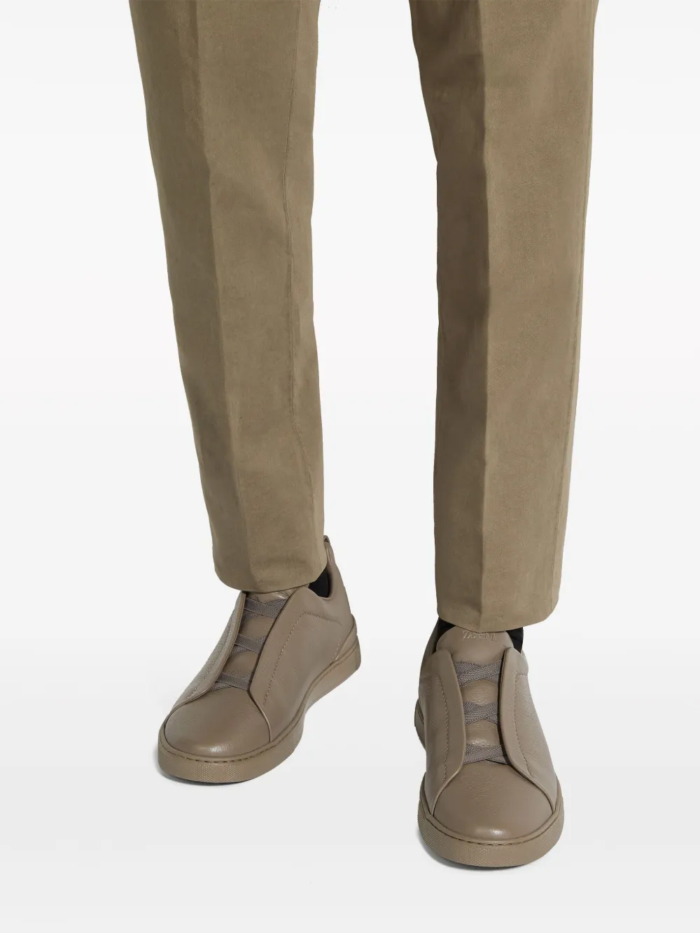 Sneaker von Zegna mit folgenden Eigenschaften: Gekörnte Textur, Zunge mit Logoprägung, überkreuzte elastische Riemen, runde Spitze, flache Gummisohle.