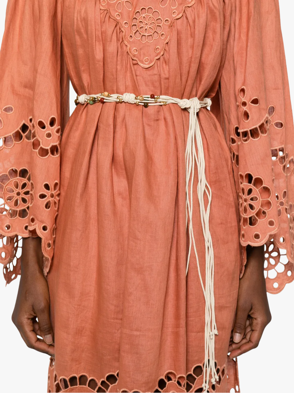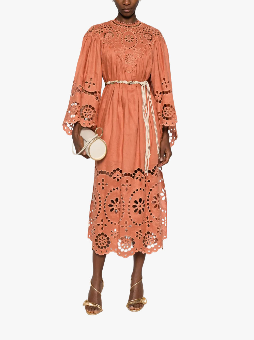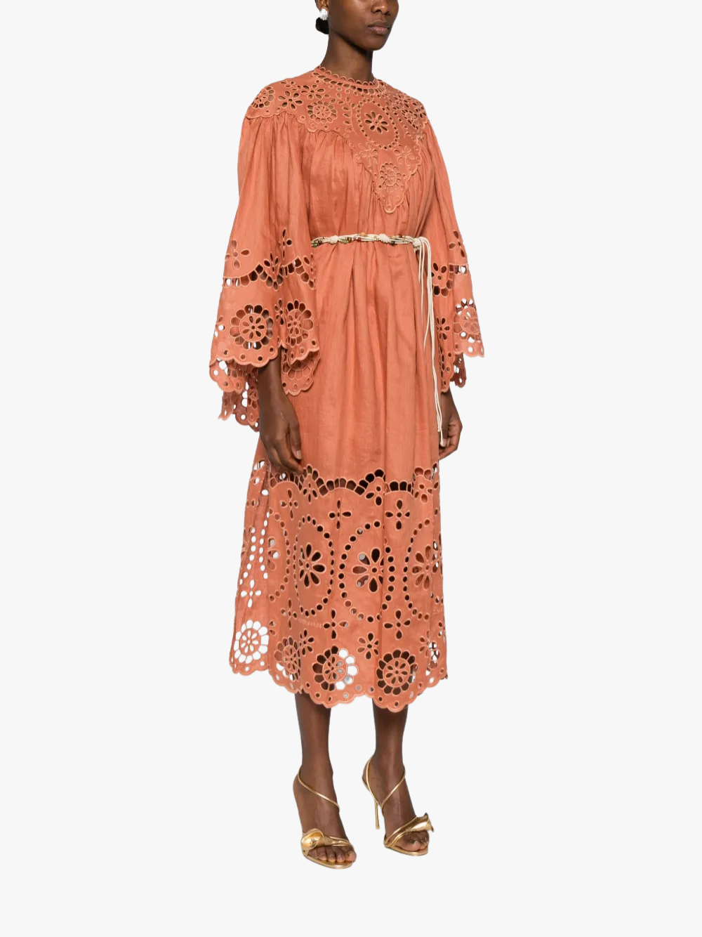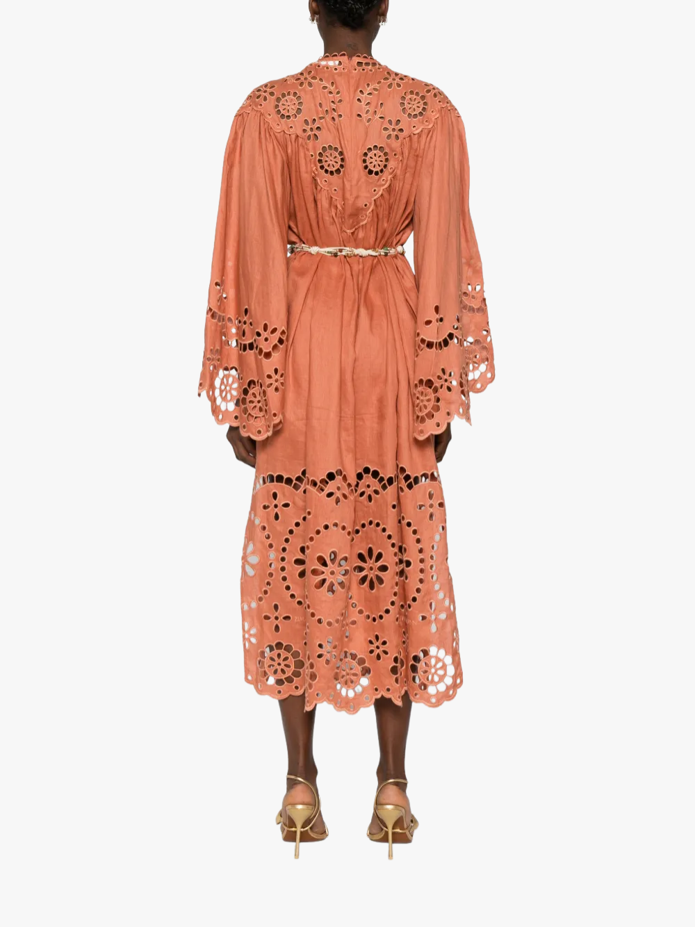 Das Awaken Embroidered Midi Dress in Zimt von Zimmermann mit folgenden Merkmalen: