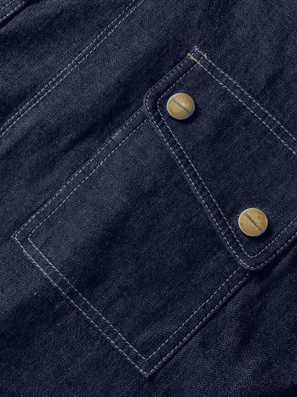 • Aufgesetzte Brusttaschen mit schrägen Klappen sowie goldene Nieten- und Topstitching-Details als charakteristische Akzente.